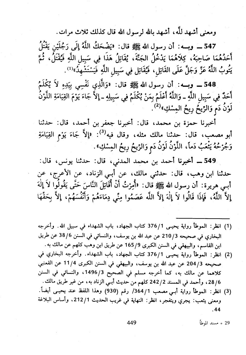 أَخْبَرَنَا حَمْزَةُ بْنُ مُحَمَّدٍ، قَالَ: أَخْبَرَنَا جَعْفَرُ بْنُ أَحْمَدَ، قَالَ: حَدَّثَنَا أَبُو مُصْعَبٍ، قَالَ: حَدَّثَنَا مَالِكٌ مِثْلَهُ، وَقَالَ فِيهِ «إِلا جَاءَ يَوْمَ الْقِيَامَةِ وَجُرْحُهُ يَثْعَبُ دَمًا، اللَّوْنُ لَوْنُ دَمٍ وَالرِّيحُ رِيحُ الْمِسْكِ»