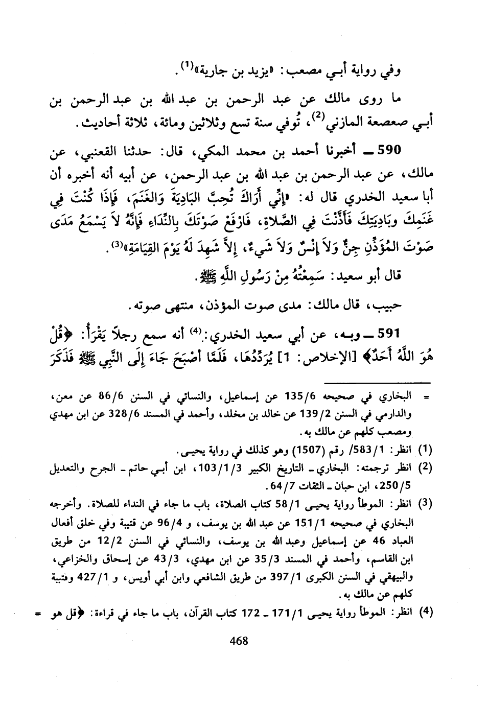 590 - أَخْبَرَنَا ابْنُ مُحَمَّدٍ الْمَكِّيُّ، قَالَ: حَدَّثَنَا الْقَعْنَبِيُّ، عَنْ مَالِكٍ، عَنْ عَبْدِ الرَّحْمَنِ بْنِ عَبْدِ اللَّهِ بْنِ عَبْدِ الرَّحْمَنِ، عَنْ أَبِيهِ أَنَّهُ أَخْبَرَهُ، أَنَّ أَبَا سَعِيدٍ الْخُدْرِيَّ، قَالَ لَهُ: «إِنِّي أَرَاكَ تُحِبُّ الْبَادِيَةَ وَالْغَنَمَ، فَإِذَا كُنْتَ فِي غَنَمِكَ وبَادِيَتِكَ فَأَذَّنْتَ فِي الصَّلاةِ، فَارْفَعْ صَوْتَكَ بِالنِّدَاءِ فَإِنَّهُ لا يَسْمَعُ مَدَى صَوْتَ المُؤَذِّنِ جِنٌّ وَلا إِنْسٌ وَلا شَيْءٌ، إِلا شَهِدَ لَهُ يَوْمَ الْقِيَامَةِ».