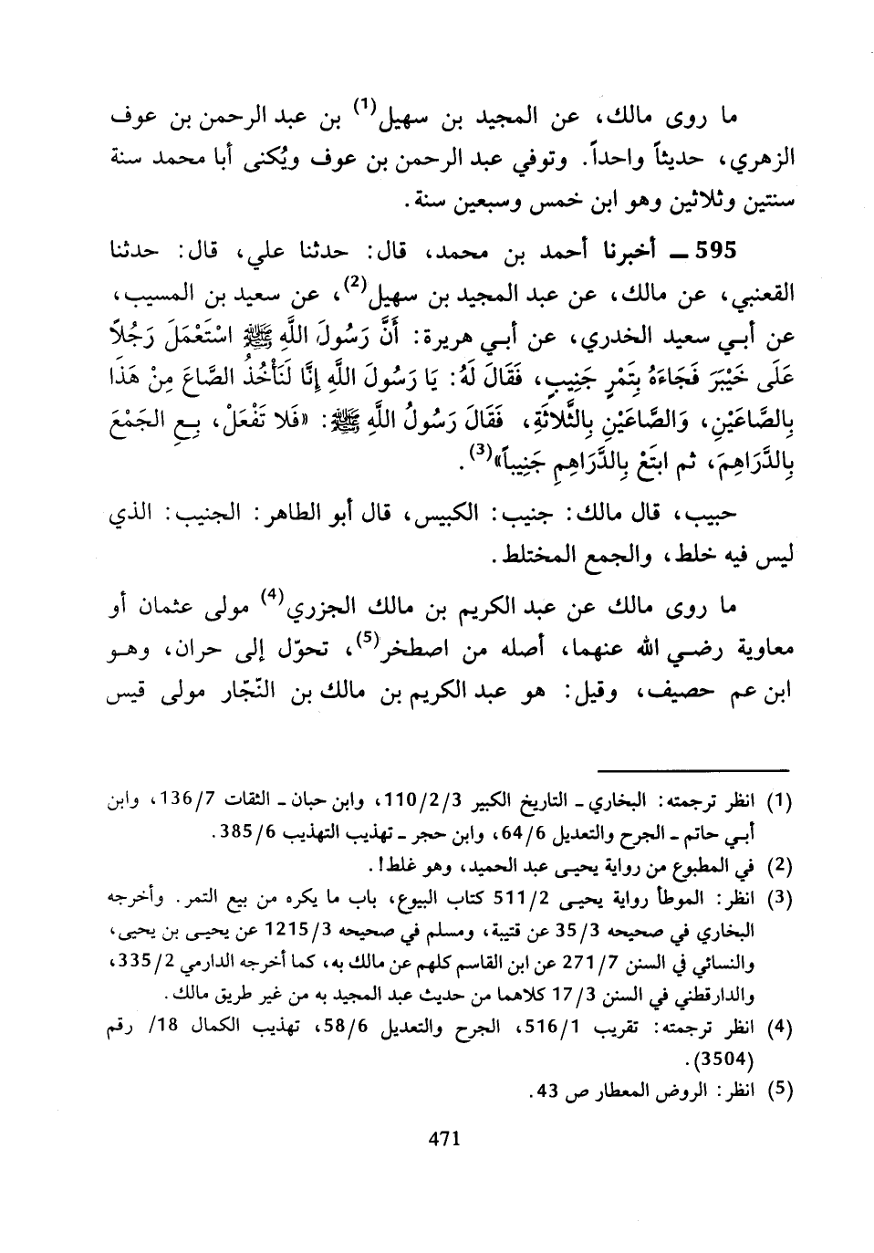 595 - أَخْبَرَنَا أَحْمَدُ بْنُ مُحَمَّدٍ، قَالَ: حَدَّثَنَا عَلِيٌّ، قَالَ: حَدَّثَنَا الْقَعْنَبِيُّ، عَنْ مَالِكٍ، عَنْ عَبْدِ الْمَجِيدِ بْنِ سُهَيْلٍ، عَنْ سَعِيدِ بْنِ الْمُسَيِّبِ، عَنْ أَبِي سَعِيدٍ الْخُدْرِيِّ، عَنْ أَبِي هُرَيْرَةَ، أَنَّ رَسُولَ اللَّهِ صَلَّى اللَّهُ عَلَيْهِ وَسَلَّمَ اسْتَعْمَلَ رَجُلا عَلَى خَيْبَرَ فَجَاءَهُ بِتَمْرٍ جَنِيبٍ، فَقَالَ لَهُ: يَا رَسُولَ اللَّهِ، إِنَّا لَنَأْخُذُ الصَّاعَ مِنْ هَذَا بِالصَّاعَيْنِ، وَالصَّاعَيْنِ بِالثَّلاثَةِ، فَقَالَ رَسُولُ اللَّهِ صَلَّى اللَّهُ عَلَيْهِ وَسَلَّمَ: «فَلا تَفْعَلْ، بِعِ الْجَمْعَ بِالدَّرَاهِمِ، ثُمَّ ابْتَعْ بِالدَّرَاهِمِ جَنِيبًا».