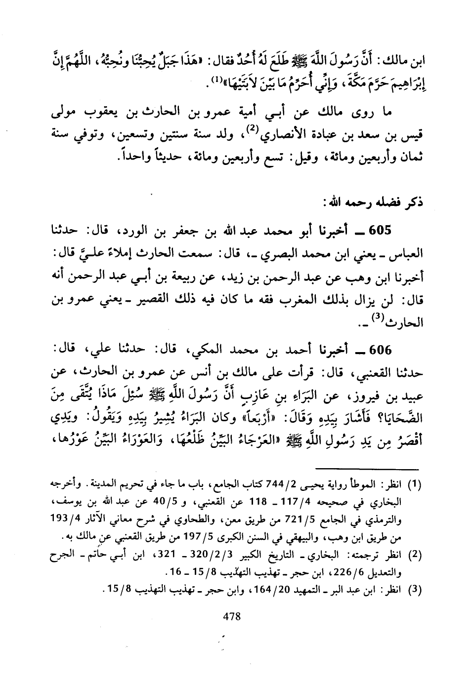 605 - أَخْبَرَنَا أَبُو مُحَمَّدٍ عَبْدُ اللَّهِ بْنُ جَعْفَرِ بْنِ الْوَرْدِ، قَالَ: حَدَّثَنَا الْعَبَّاسُ، يَعْنِي ابْنَ مُحَمَّدٍ الْبَصْرِيَّ، قَالَ: سَمِعْتُ الْحَارِثَ، إِمْلاءً عَلَيَّ، قَالَ: أَخْبَرَنَا ابْنُ وَهْبٍ، عَنْ عَبْدِ الرَّحْمَنِ بْنِ زَيْدٍ، عَنْ رَبِيعَةَ بْنِ أَبِي عَبْدِ الرَّحْمَنِ، أَنَّهُ قَالَ: لَنْ يَزَالَ بِذَلِكَ الْمَغْرِبِ فِقْهٌ مَا كَانَ فِيهِ ذَلِكَ الْقَصِيرُ، يَعْنِي: عَمْرَو بْنَ الْحَارِثِ.