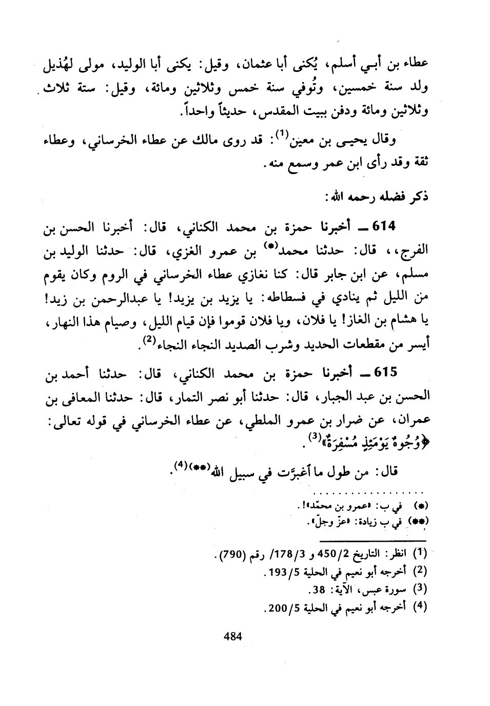 615 - أَخْبَرَنَا حَمْزَةُ بْنُ مُحَمَّدٍ الْكِنَانِيُّ، قَالَ: حَدَّثَنَا أَحْمَدُ بْنُ الْحَسَنِ بْنِ عَبْدِ الْجَبَّارِ، قَالَ: حَدَّثَنَا أَبُو نَصْرٍ التَّمَّارُ، قَالَ: حَدَّثَنَا الْمُعَافَى بْنُ عِمْرَانَ، عَنْ ضِرَارِ بْنِ عَمْرٍو الْمَلْطِيِّ، عَنْ عَطَاءٍ الْخُرَسَانِيِّ فِي قَوْلِهِ تَعَالَى: {وُجُوهٌ يَوْمَئِذٍ مُسْفِرَةٌ} [عبس: 38].