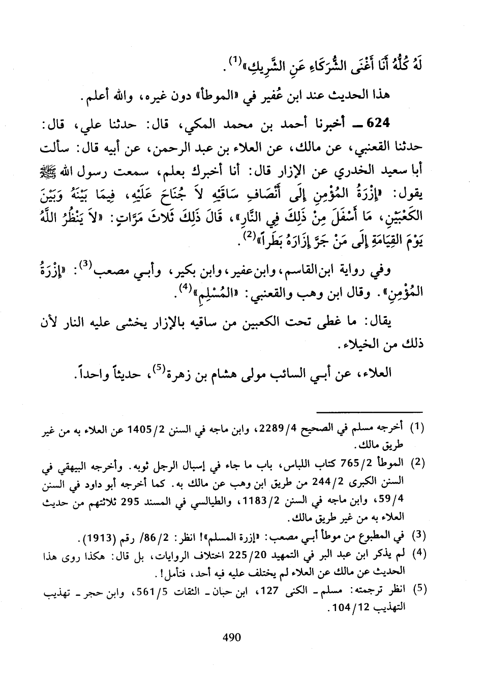 624 - أَخْبَرَنَا أَحْمَدُ بْنُ مُحَمَّدٍ الْمَكِّيُّ، قَالَ: حَدَّثَنَا عَلِيٌّ، قَالَ: حَدَّثَنَا الْقَعْنَبِيُّ، عَنْ مَالِكٍ، عَنِ الْعَلاءِ بْنِ عَبْدِ الرَّحْمَنِ، عَنْ أَبِيهِ، قَالَ: سَأَلْتُ أَبَا سَعِيدٍ الْخُدْرِيَّ عَنِ الإِزَارِ، قَالَ: أَنَا أُخْبِرُكَ بِعِلْمٍ، سَمِعْتُ رَسُولَ اللَّهِ صَلَّى اللَّهُ عَلَيْهِ وَسَلَّمَ يَقُولُ: " إِزْرَةُ الْمُؤْمِنِ إِلَى أَنْصَافِ سَاقَيْهِ لا جُنَاحَ عَلَيْهِ، فِيمَا بَيْنَهُ وَبَيْنَ الْكَعْبَيْنِ، مَا أَسْفَلَ مِنْ ذَلِكَ فِي النَّارِ.