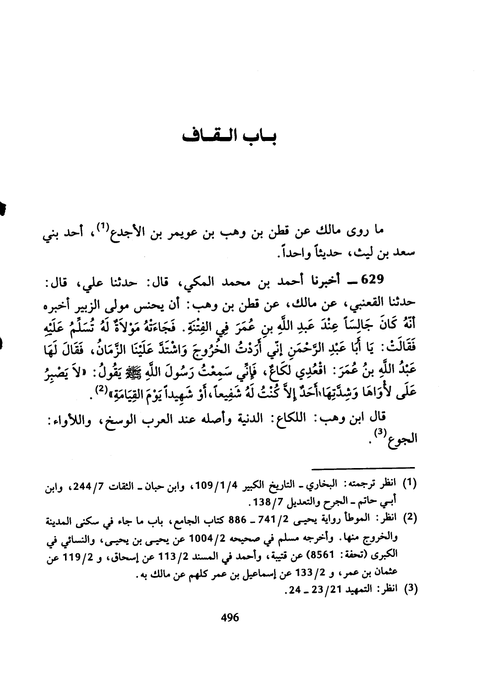 مَا رَوَى مَالِكٌ عَنْ قَطَنِ بْنِ وَهْبِ بْنِ عُوَيْمِرِ بْنِ الأَجْدَعِ