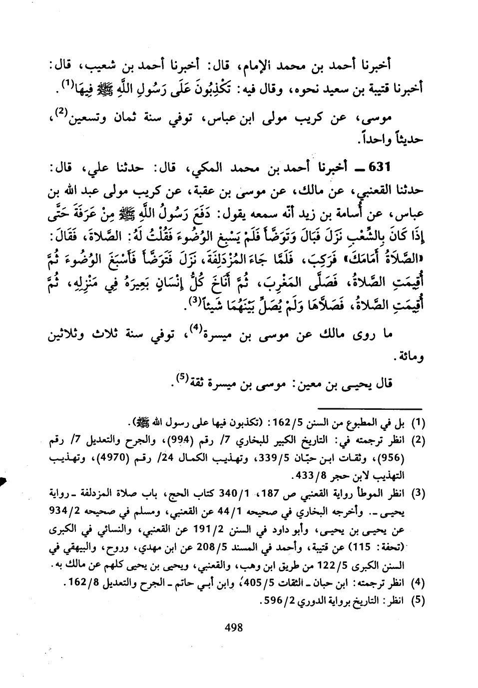 631 - أَخْبَرَنَا أَحْمَدُ بْنُ مُحَمَّدٍ الْمَكِّيُّ، قَالَ: حَدَّثَنَا عَلِيٌّ، قَالَ: حَدَّثَنَا الْقَعْنَبِيُّ، عَنْ مَالِكٍ، عَنْ مُوسَى بْنِ عُقْبَةَ، عَنْ كُرَيْبٍ مَوْلَى عَبْدِ اللَّهِ بْنِ عَبَّاسٍ، عَنْ أُسَامَةَ بْنِ زَيْدٍ ٍأَنَّهُ سَمِعَهُ يَقُولُ: دَفَعَ رَسُولُ اللَّهِ صَلَّى اللَّهُ عَلَيْهِ وَسَلَّمَ مِنْ عَرَفَةَ حَتَّى إِذَا كَانَ بِالشِّعْبِ نَزَلَ فَبَالَ وَتَوَضَّأَ فَلَمْ يُسْبِغِ الْوُضُوءَ فَقُلْتُ لَهُ: الصَّلاةَ.