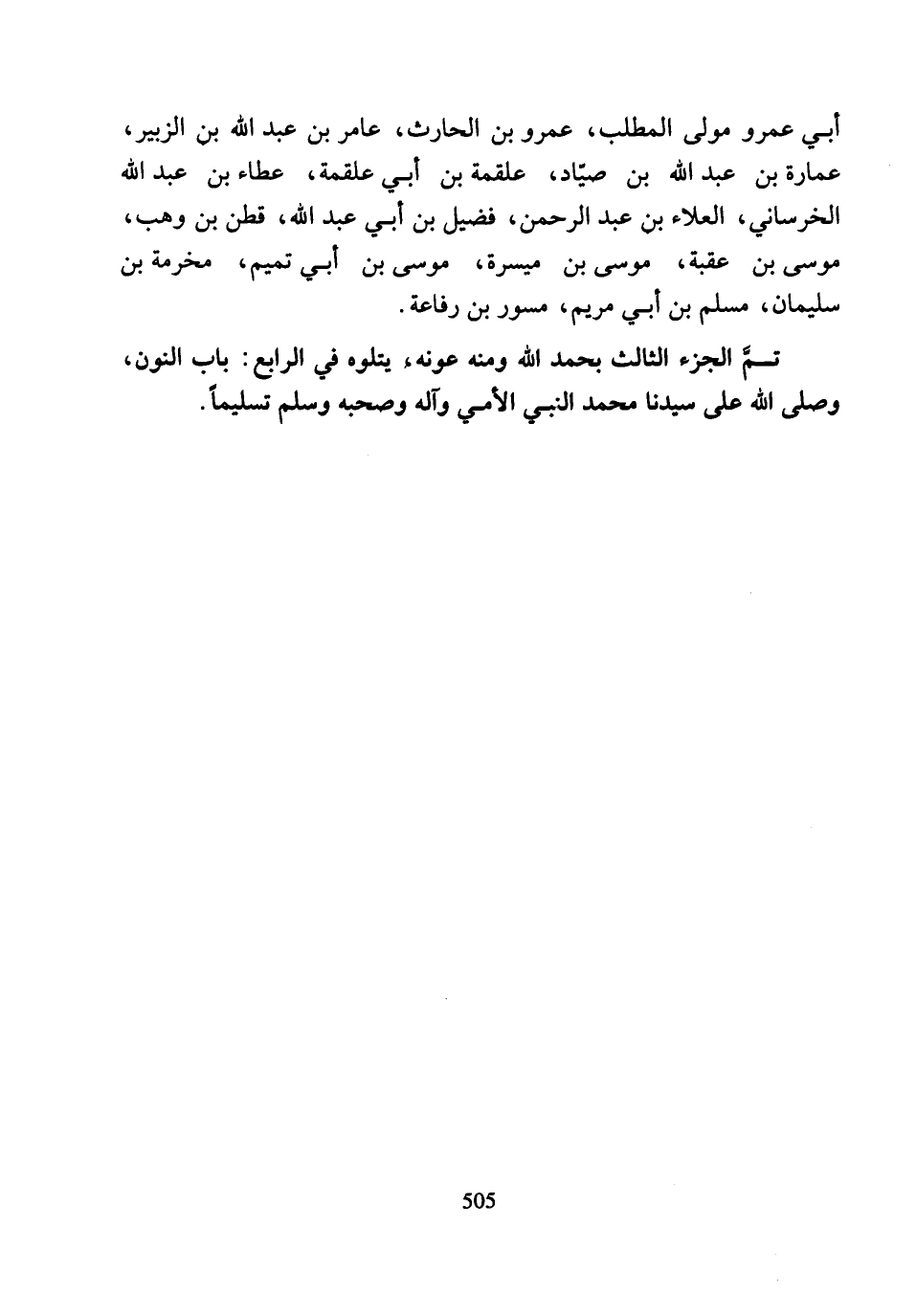 تَمَّ الْجُزْءُ الثَّالِثُ بِحَمْدِ اللَّهِ وَمِنْهُ عَوْنُهُ، يَتْلُوهُ فِي الرَّابِعِ بَابُ النُّونِ، وَصَلَّى اللَّهُ عَلَيْهِ سَيِّدِنَا مُحَمَّدٍ النَّبِيِّ الأُمِّيِّ وَآلِهِ وَصَحْبِهِ وَسَلَّمَ تَسْلِيمًا.
