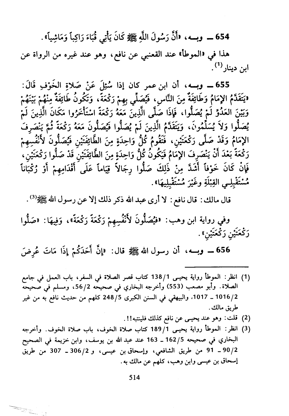 655 - وَبِهِ، أَنَّ ابْنَ عُمَرَ كَانَ إِذَا سُئِلَ عَنْ صَلاةِ الْخَوْفِ، قَالَ: «يَتَقَدَّمُ الإِمَامُ وَطَائِفَةٌ مِنَ النَّاسِ، فَيُصَلِّي بِهِمْ رَكْعَةً، وَتَكُونُ طَائِفَةٌ مِنْهُمْ بَيْنَهُمْ وَبَيْنَ الْعَدُوِّ لَمْ يُصَلُّوا، فَإِذَا صَلَّى الَّذِينَ مَعَهُ رَكْعَةً اسْتَأْخَرُوا مَكَانَ الَّذِي لَمْ يُصَلُّوا وَلا يُسَلِّمُونَ، وَيَتَقَدَّمُ الَّذِينَ لَمْ يُصَلُّوا فَيُصَلُّونُ مَعَهُ رَكْعَةً ثُمَّ يَنْصَرِفُ الإِمَامُ وَقَدْ صَلَّى رَكْعَتَيْنِ، فَتَقُومُ كُلُّ وَاحِدَةٍ مِنَ الطَّائِفَتَيْنِ، فَيُصَلُّونَ لأَنْفُسِهِمْ رَكْعَةً بَعْدَ أَنْ يَنْصَرِفَ الإِمَامُ، فَيَكُونُ كُلُّ وَاحِدَةٍ مِنَ الطَّائِفَتَيْنِ قَدْ صَلُّوا رَكْعَتَيْنِ، فَإِنْ كَانَ خَوْفًا أَشَدَّ مِنْ ذَلِكَ صَلُّوا رِجَالا قِيَامًا عَلَى أَقْدَامِهِمْ أَوْ رُكْبَانًا مُسْتَقْبِلِي الْقِبْلَةِ وَغَيْرَ مُسْتَقْبِلِيهَا».