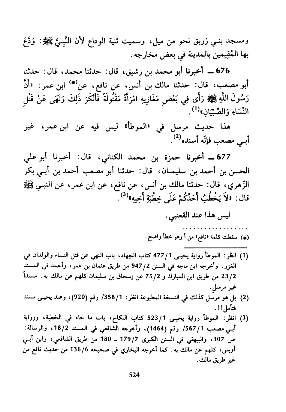 676 - أَخْبَرَنَا أَبُو مُحَمَّدِ بْنُ رَشِيقٍ، قَالَ: حَدَّثَنَا مُحَمَّدٌ، قَالَ: حَدَّثَنَا أَبُو مُصْعَبٍ، قَالَ: حَدَّثَنَا مَالِكُ بْنُ أَنَسٍ، عَنْ نَافِعٍ، عَنِ ابْنِ عُمَرَ «أَنَّ رَسُولَ اللَّهِ صَلَّى اللَّهُ عَلَيْهِ وَسَلَّمَ» رَأَى فِي بَعْضِ مَغَازِيهِ امْرَأَةً مَقْتُولَةً فَأَنْكَرَ ذَلِكَ وَنَهَى عَنْ قَتْلِ النِّسَاءِ وَالصِّبْيانِ ".