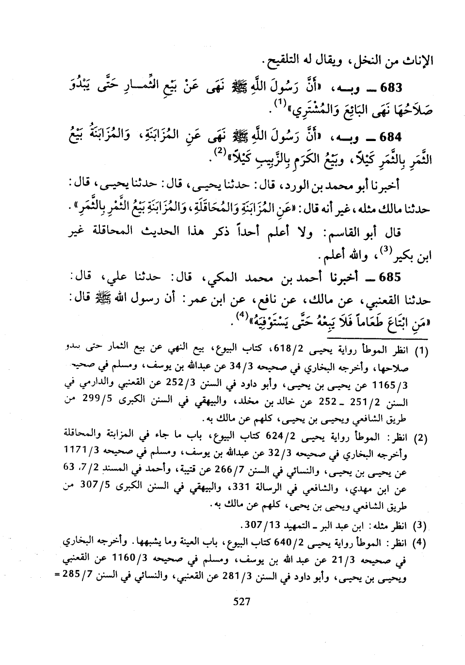 685 - أَخْبَرَنَا أَحْمَدُ بْنُ مُحَمَّدٍ الْمَكِّيُّ، قَالَ: حَدَّثَنَا عَلِيٌّ، قَالَ: حَدَّثَنَا الْقَعْنَبِيُّ، عَنْ مَالِكٍ، عَنْ نَافِعٍ، عَنِ ابْنِ عُمَرَ، أَنَّ رَسُولَ اللَّهِ صَلَّى اللَّهُ عَلَيْهِ وَسَلَّمَ، قَالَ: «مَنِ ابْتَاعَ الطَّعَامَ فَلا يَبِعْهُ حَتَّى يَسْتَوْفِيَهُ»