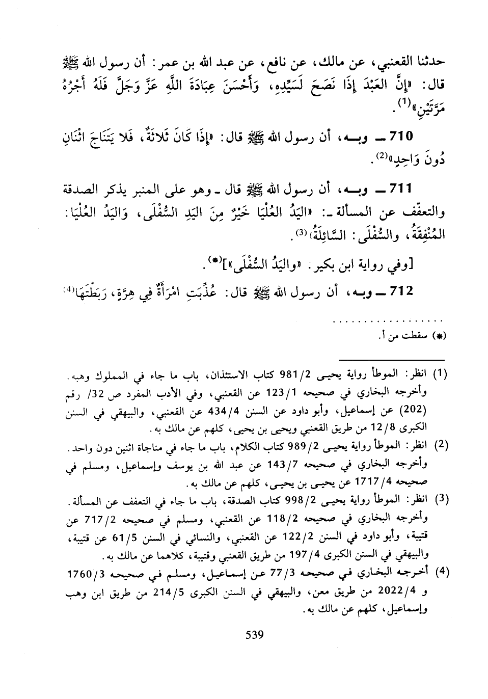 710 - وَبِهِ، أَنَّ رَسُولَ اللَّهِ صَلَّى اللَّهُ عَلَيْهِ وَسَلَّمَ قَالَ: «إِذَا كَانَ ثَلاثَةٌ، فَلا يَتَنَاجَ اثْنَانِ دُونَ وَاحِدٍ»