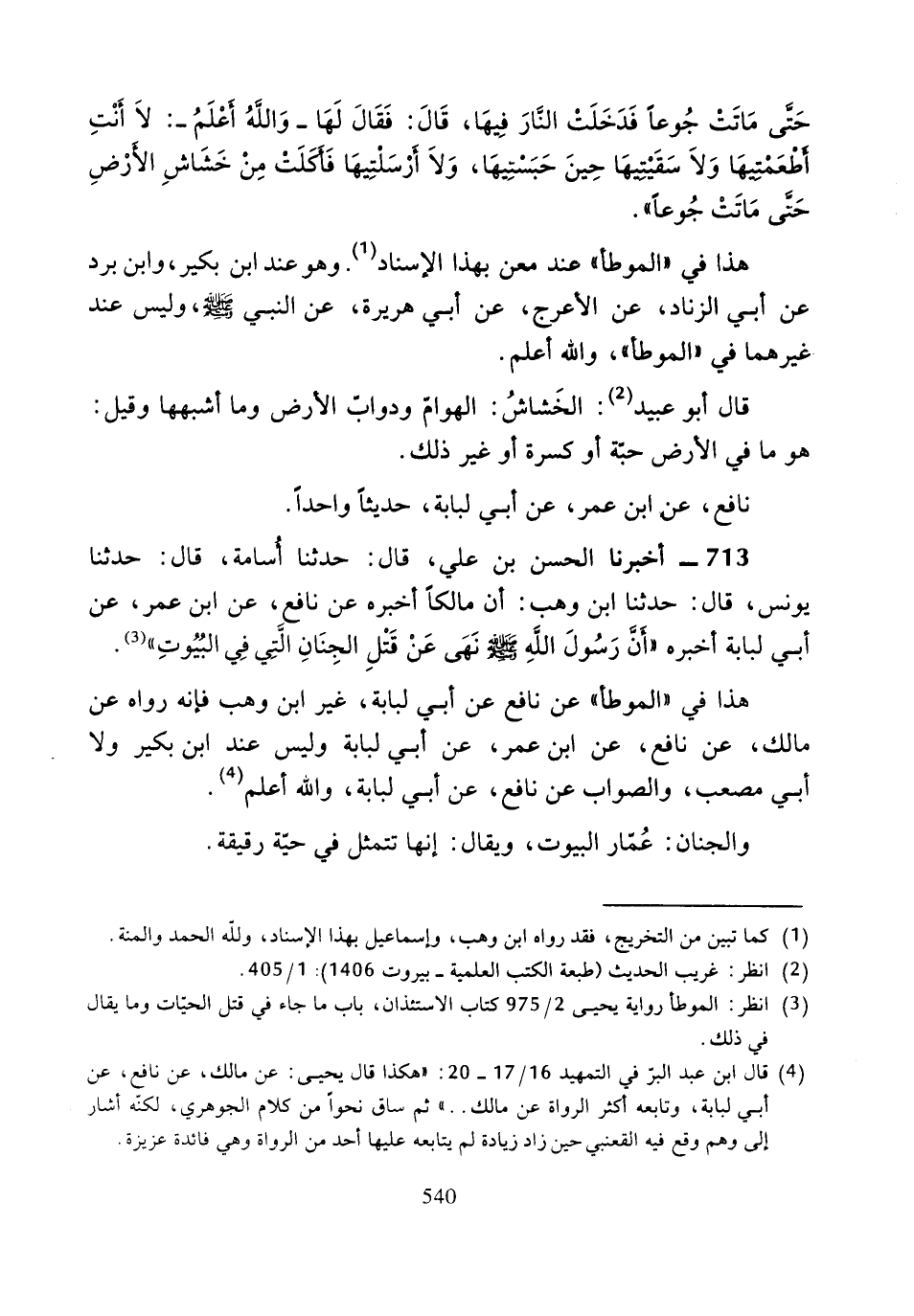 713 - أَخْبَرَنَا الْحَسَنُ بْنُ عَلِيٍّ، قَالَ: حَدَّثَنَا أُسَامَةُ، قَالَ: حَدَّثَنَا يُونُسُ، قَالَ: حَدَّثَنَا ابْنُ وَهْبٍ أَنَّ مَالِكًا أَخْبَرَهُ، عَنْ نَافِعٍ، عَنِ ابْنِ عُمَرَ، عَنْ أَبِي لُبَابَةَ أَخْبَرَهُ: أَنَّ رَسُولَ اللَّهِ صَلَّى اللَّهُ عَلَيْهِ وَسَلَّمَ «نَهَى عَنْ قَتْلِ الْجَنَانِ الَّتِي فِي الْبُيُوتِ».