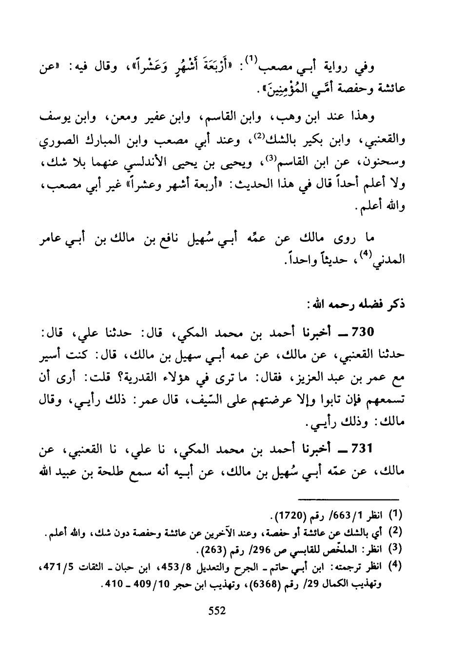 730 - أَخْبَرَنَا أَحْمَدُ بْنُ مُحَمَّدٍ الْمَكِّيُّ، قَالَ: حَدَّثَنَا عَلِيٌّ، قَالَ: حَدَّثَنَا الْقَعْنَبِيُّ، عَنْ مَالِكٍ، عَنْ عَمِّهِ أَبِي سُهَيْلِ بْنِ مَالِكٍ، قَالَ: كُنْتُ أَسِيرُ مَعَ عُمَرَ بْنِ عَبْدِ الْعَزِيزِ، فَقَالَ: مَا تَرَى فِي هَؤُلاءِ الْقَدَرِيَّةِ؟ قُلْتُ: أَرَى أَنْ تَسْمَعَهُمْ فَإِنْ تَابُوا وَأَلا عَرَضْتَهُمْ عَلَى السَّيْفِ، قَالَ عُمَرُ: ذَلِكَ رَأْيِي، وَقَالَ مَالِكٌ: وَذَلِكَ رَأْيِي.