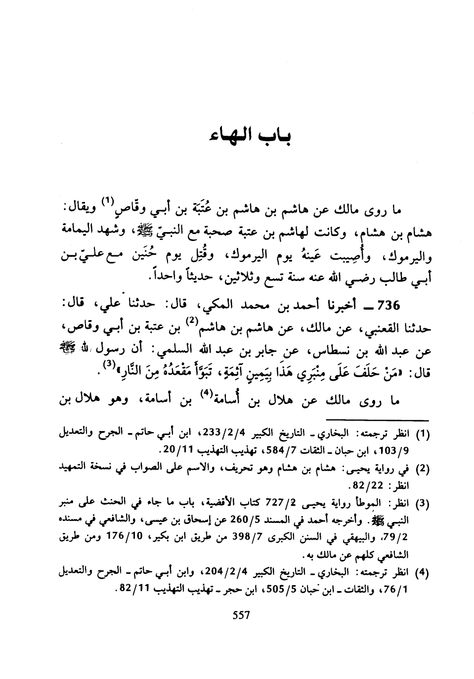 736 - أَخْبَرَنَا أَحْمَدُ بْنُ مُحَمَّدٍ الْمَكِّيُّ، قَالَ: حَدَّثَنَا عَلِيٌّ، قَالَ: حَدَّثَنَا الْقَعْنَبِيُّ، عَنْ مَالِكٍ، عَنْ هَاشِمِ بْنِ هَاشِمِ بْنِ عُتْبَةَ بْنِ أَبِي وَقَّاصٍ، عَنْ عَبْدِ اللَّهِ بْنِ نِسْطَاسَ، عَنْ جَابِرِ بْنِ عَبْدِ اللَّهِ السُّلَمِيِّ: أَنَّ رَسُولَ اللَّهِ صَلَّى اللَّهُ عَلَيْهِ وَسَلَّمَ، قَالَ: «مَنْ حَلَفَ عَلَى مِنْبَرِي هَذَا بِيَمِينٍ آثِمَةٍ، تَبَوَّأَ مَقْعَدَهُ مِنَ النَّارِ»