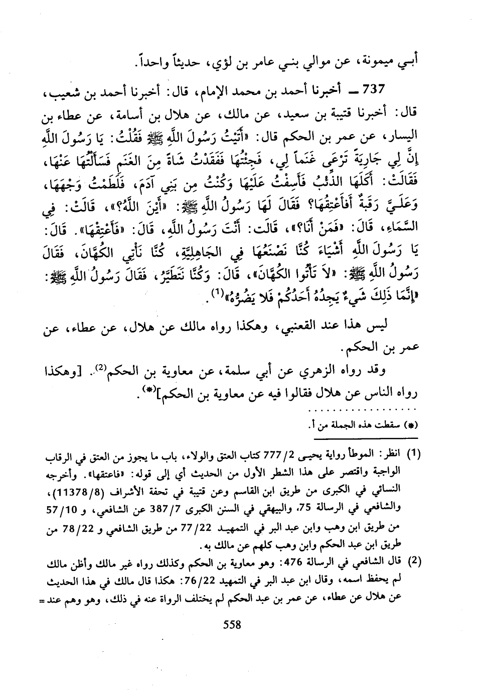 737 - أَخْبَرَنَا أَحْمَدُ بْنُ مُحَمَّدٍ الإِمَامُ، قَالَ: أَخْبَرَنَا أَحْمَدُ بْنُ شُعَيْبٍ، قَالَ: أَخْبَرَنَا قُتَيْبَةُ بْنُ سَعِيدٍ، عَنْ مَالِكٍ، عَنْ هِلالِ بْنِ أُسَامَةَ، عَنْ عَطَاءِ بْنِ الْيَسَارِ، عَنْ عُمَرَ بْنِ الْحَكَمِ، قَالَ: " أَتَيْتُ رَسُولَ اللَّهِ صَلَّى اللَّهُ عَلَيْهِ وَسَلَّمَ، فَقُلْتُ: يَا رَسُولَ اللَّهِ، إِنَّ لِي جَارِيَةً تَرْعَى غَنَمًا لِي، فَجِئْتُهَا، فَفَقَدَتْ شَاةً مِنَ الْغَنَمِ، فَسَأَلْتُهَا عَنْهَا، فَقَالَتْ: أَكَلَهَا الذِّئْبُ، فَأَسِفْتُ عَلَيْهَا، وَكُنْتُ مِنْ بَنِي آدَمَ، فَلَطَمْتُ وَجْهَهَا، وَعَليَّ رَقَبَةٌ أَفَأَعْتِقُهَا؟ فَقَالَ لَهَا رَسُولُ اللَّهِ صَلَّى اللَّهُ عَلَيْهِ وَسَلَّمَ: أَيْنَ اللَّهُ؟، فَقَالَتْ: فِي السَّمَاءِ.