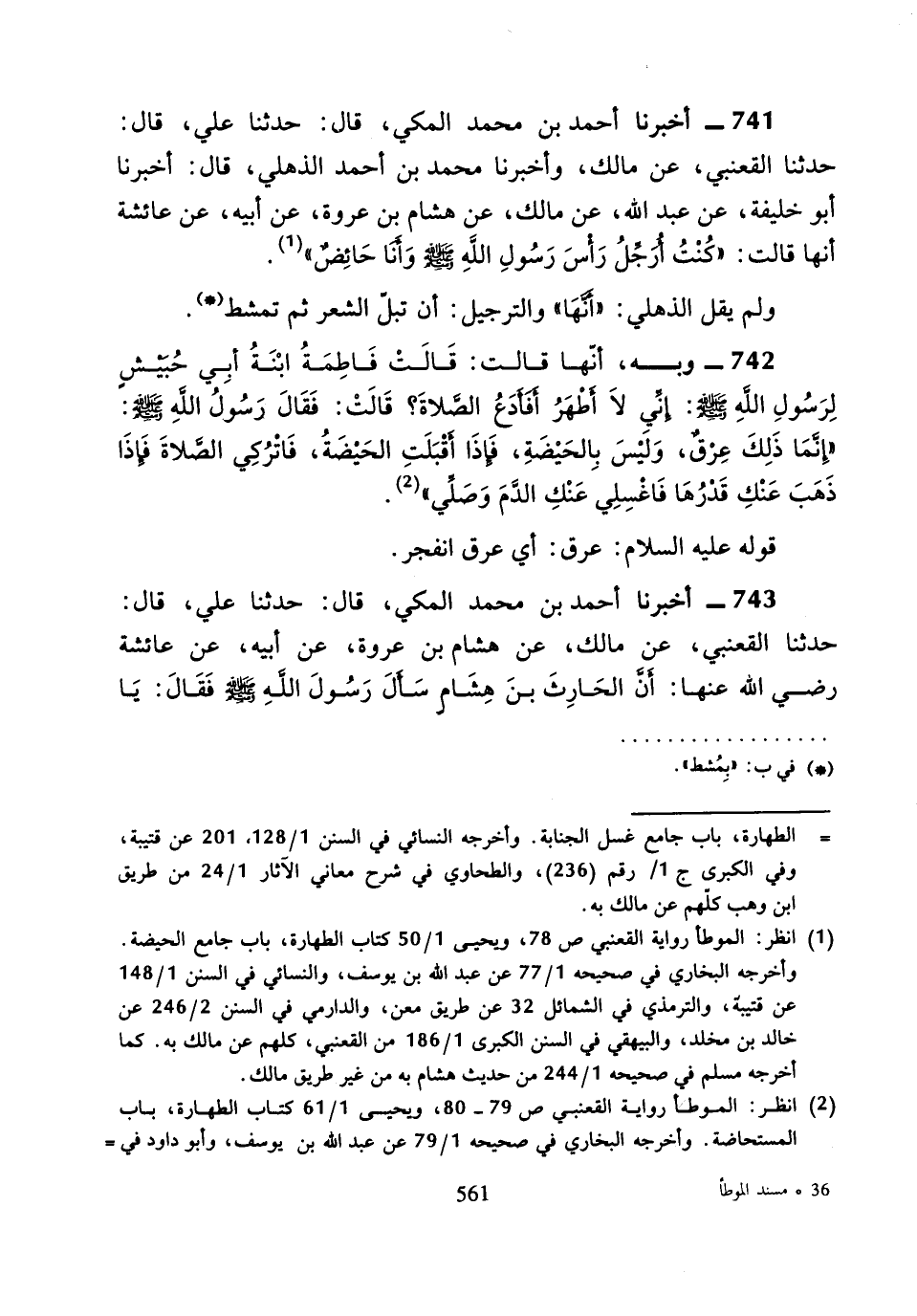 741 - أَخْبَرَنَا أَحْمَدُ بْنُ مُحَمَّدٍ الْمَكِّيُّ، قَالَ: حَدَّثَنَا عَلِيٌّ، قَالَ: حَدَّثَنَا الْقَعْنَبِيُّ، عَنْ مَالِكٍ، وَأَخْبَرَنَا مُحَمَّدُ بْنُ أَحْمَدَ الذُّهْلِيُّ، قَالَ: أَخْبَرَنَا أَبُو خَلِيفَةَ، عَنْ عَبْدِ اللَّهِ، عَنْ مَالِكٍ، عَنْ هِشَامِ بْنِ عُرْوَةَ، عَنْ أَبِيهِ، عَنْ عَائِشَةَ، أَنَّهَا قَالَتْ: «كُنْتُ أُرَجِّلُ رَأْسَ رَسُولِ اللَّهِ صَلَّى اللَّهُ عَلَيْهِ وَسَلَّمَ وَأَنَا حَائِضٌ».