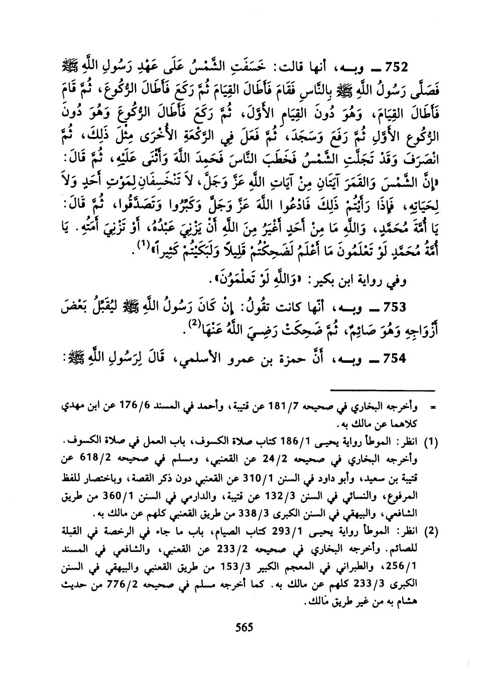 752 - وَبِهِ، أَنَّهَا قَالَتْ: خَسَفَتِ الشَّمْسُ عَلَى عَهْدِ رَسُولِ اللَّهِ صَلَّى اللَّهُ عَلَيْهِ وَسَلَّمَ فَصَلَّى رَسُولُ اللَّهِ صَلَّى اللَّهُ عَلَيْهِ وَسَلَّمَ بِالنَّاسِ فَقَامَ فَأَطَالَ الْقِيَامَ ثُمَّ رَكَعَ فَأَطَالَ الرُّكُوعَ، ثُمَّ قَامَ فَأَطَالَ الْقِيَامَ، وَهُوَ دُونَ الْقِيامِ الأَوَّلِ، ثُمَّ رَكَعَ فَأَطَالَ الرُّكُوعَ وَهُوَ دُونَ الرُّكُوعِ الأَوَّلِ، ثُمَّ رَفَعَ وَسَجَدَ، ثُمَّ فَعَلَ فِي الرَّكْعَةِ الأُخْرَى مِثْلَ ذَلِكَ، ثُمَّ انْصَرَفَ وَقَدْ تَجَلَّتِ الشَّمْسُ فَخَطَبَ النَّاسَ فَحَمِدَ اللَّهَ وَأَثْنَى عَلَيْهِ، ثُمَّ قَالَ: " إِنَّ الشَّمْسَ وَالْقَمَرَ آيَتَانِ مِنْ آيَاتِ اللَّهِ عَزَّ وَجَلَّ، لا تَنْخَسِفَانِ لِمَوْتِ أَحَدٍ وَلا لِحَيَاتِهِ، فَإِذَا رَأَيْتُمْ ذَلِكَ فَادْعُوا اللَّهَ عَزَّ وَجَلَّ وَكَبِّرُوا وَتَصَدَّقُوا، ثُمَّ قَالَ: يَا أُمَّةَ مُحَمَّدٍ، وَاللَّهِ مَا مِنْ أَحَدٍ أَغْيَرُ مِنَ اللَّهِ أَنْ يَزْنِيَ عَبْدُهُ، أَوْ تَزْنِيَ أَمَتُهُ، يَا أُمَّةَ مُحَمَّدٍ لَوْ تَعْلَمُونَ مَا أَعْلَمُ لَضَحِكْتُمْ قَلِيلا وَلَبَكَيْتُمْ كَثِيرًا ".