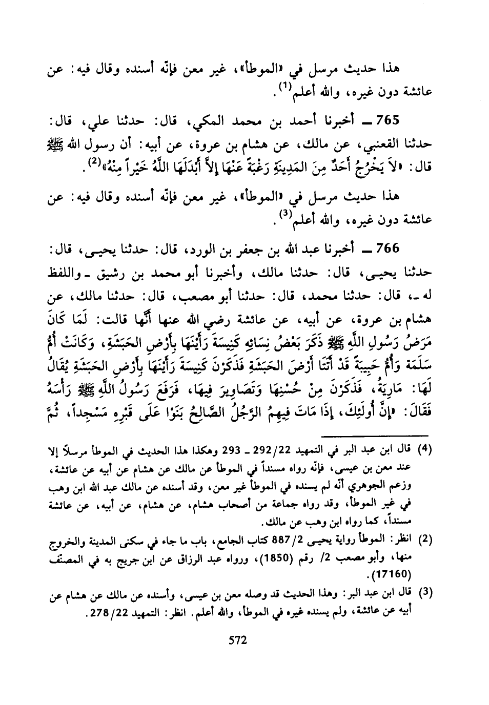766 - أَخْبَرَنَا عَبْدُ اللَّهِ بْنُ جَعْفَرِ بْنِ الْوَرْدِ، قَالَ: حَدَّثَنَا يَحْيَى، قَالَ: حَدَّثَنَا يَحْيَى، قَالَ: حَدَّثَنَا مَالِكٌ، وَأَخْبَرَنَا أَبُو مُحَمَّدِ بْنُ رَشِيقٍ وَاللَّفْظُ لَهُ، قَالَ: حَدَّثَنَا مُحَمَّدٌ، قَالَ: حَدَّثَنَا أَبُو مُصْعَبٍ، قَالَ: حَدَّثَنَا مَالِكٌ، عَنْ هِشَامِ بْنِ عُرْوَةَ، عَنْ أَبِيهِ، عَنْ عَائِشَةَ رَضِيَ اللَّهُ عَنْهَا، قَالَتْ: " لَمَّا كَانَ مَرَضُ رَسُولِ اللَّهِ صَلَّى اللَّهُ عَلَيْهِ وَسَلَّمَ ذَكَرَ بَعْضُ نِسَائِهِ كَنِيسَةً رَأَيْنَهَا بِأَرْضِ الْحَبَشَةِ، وَكَانَتْ أُمُّ سَلَمَةَ، وَأُمُّ حَبِيبَةَ قَدْ أَتَتَا أَرْضَ الْحَبَشَةِ فَذَكَرْنَ كَنِيسَةً رَأَيْنَهَا بِأَرْضِ الْحَبَشَةِ، يُقَالُ لَهَا: مَارِيَةُ، فَذَكَرْنَ مِنْ حُسْنِهَا وَتَصَاوِيرَ فِيهَا، فَرَفَعَ رَسُولُ اللَّهِ صَلَّى اللَّهُ عَلَيْهِ وَسَلَّمَ رَأْسَهُ، فَقَالَ: «إِنَّ أُولَئِكَ، إِذَا مَاتَ فِيهِمُ الرَّجُلُ الصَّالِحُ بَنَوْا عَلَى قَبْرِهِ مَسْجِدًا، ثُمَّ