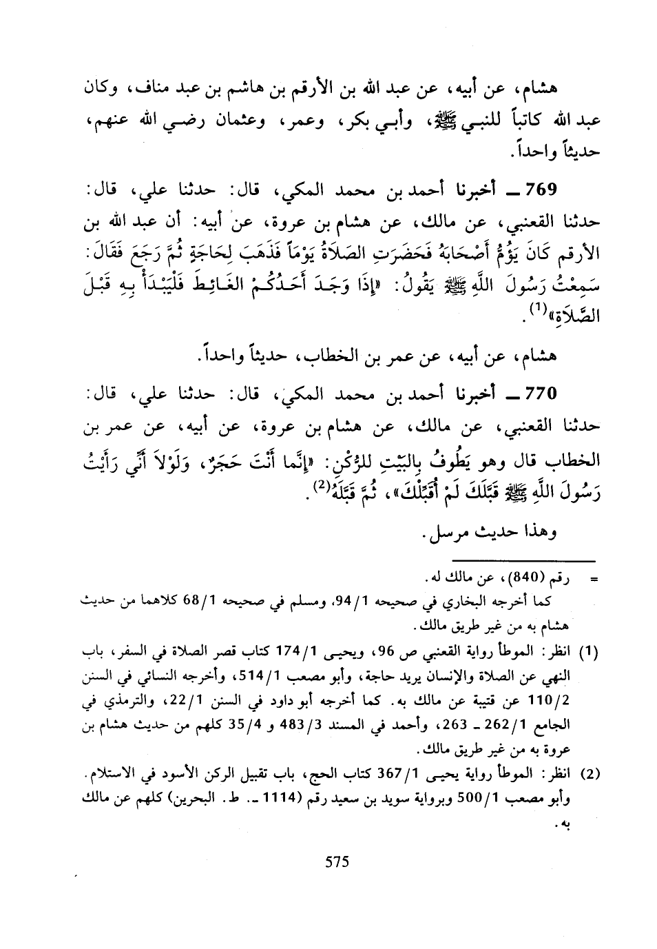 769 - أَخْبَرَنَا أَحْمَدُ بْنُ مُحَمَّدٍ الْمَكِّيُّ، قَالَ: حَدَّثَنَا عَلِيٌّ، قَالَ: حَدَّثَنَا الْقَعْنَبِيُّ، عَنْ مَالِكٍ، عَنْ هِشَامِ بْنِ عُرْوَةَ، عَنْ أَبِيهِ أَنَّ عَبْدَ اللَّهِ بْنَ الأَرْقَمِ كَانَ يَؤُمُّ أَصْحَابَهُ فَحَضَرَتِ الصَّلاةُ يَوْمًَا فَذَهَبَ لِحَاجَةٍ ثُمَّ رَجَعَ فَقَالَ: سَمِعْتُ رَسُولَ اللَّهِ صَلَّى اللَّهُ عَلَيْهِ وَسَلَّمَ، يَقُولُ: «إِذَا وَجَدَ أَحَدُكُمُ الْغَائِطَ فَلْيَبْدَأْ بِهِ قَبْلَ الصَّلاةِ».