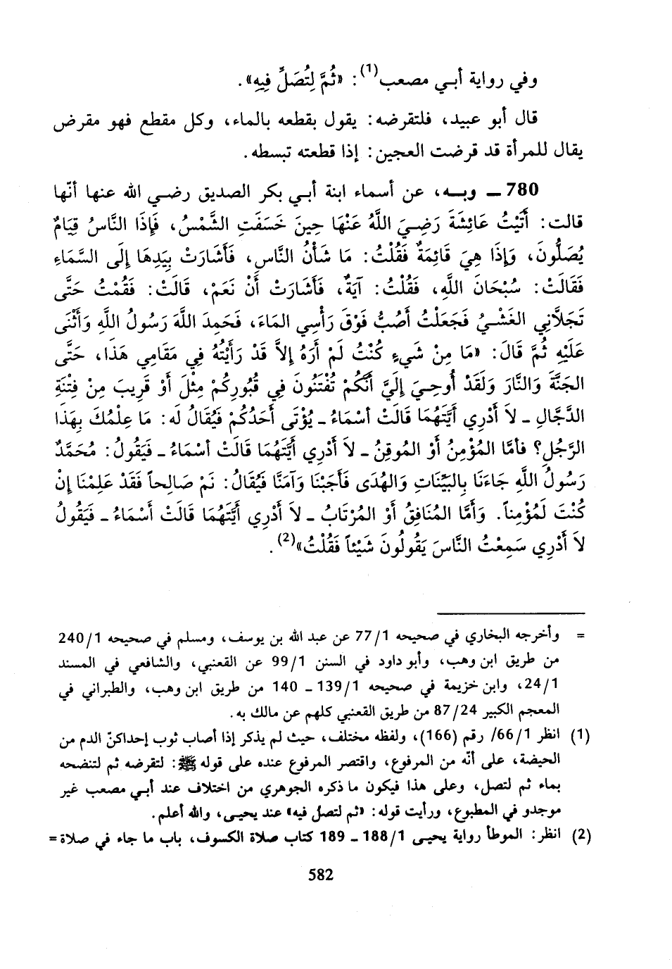 780 - وَبِهِ، عَنْ أَسْمَاءَ ابْنَةِ أَبِي بَكْرٍ الصِّدِّيقِ رَضِيَ اللَّهُ عَنْهَا، أَنَّهَا قَالَتْ: أَتَيْتُ عَائِشَةَ رَضِيَ اللَّهُ عَنْهَا حِينَ خَسَفَتِ الشَّمْسُ، فَإِذَا النَّاسُ قِيَامٌ يُصَلُّونَ وَإِذَا هِيَ قَائِمَةٌ فَقُلْتُ: مَا شَأْنُ النَّاسِ، فَأَشَارَتْ بِيَدِهَا إِلَى السَّمَاءِ، فَقَالَتْ: سُبْحَانَ اللَّهِ، فَقُلْتُ: آيَةٌ.