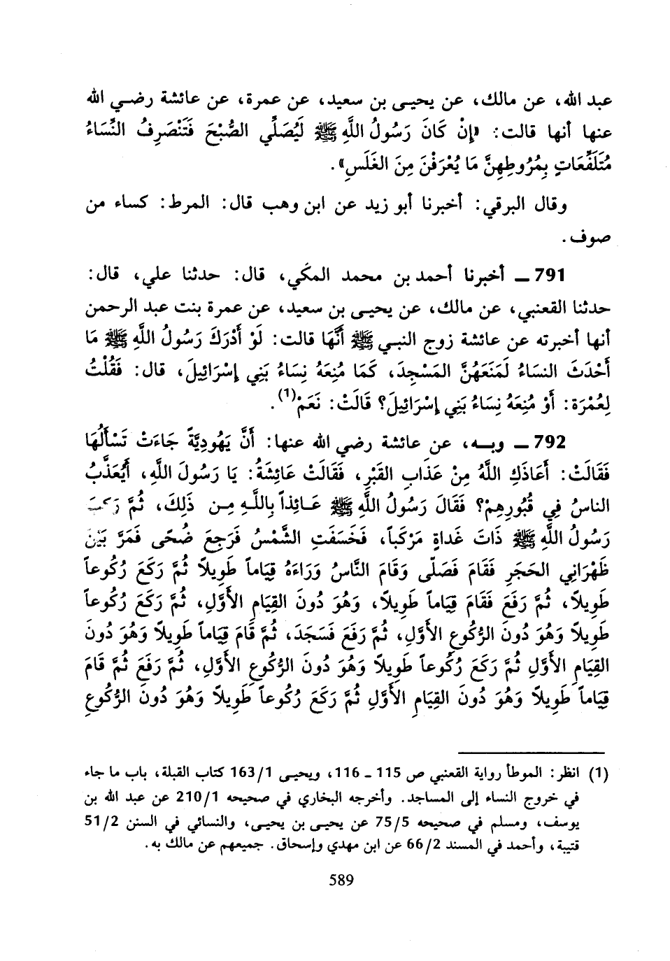 عَبْدِ اللَّهِ، عَنْ مَالِكٍ، عَنْ يَحْيَى بْنِ سَعِيدٍ عَنْ عَمْرَةَ، عَنْ عَائِشَةَ رَضِيَ اللَّهُ عَنْهَا، أَنَّهَا قَالَتْ: «إِنْ كَانَ رَسُولُ اللَّهِ صَلَّى اللَّهُ عَلَيْهِ وَسَلَّمَ لَيُصَلِّيَ الصُّبْحَ فَتَنْصَرِفُ النِّسَاءُ مُتَلَفِّعَاتٍ بِمُرُوطِهِنَّ مَا يُعْرَفْنَ مِنَ الْغَلَسِ».