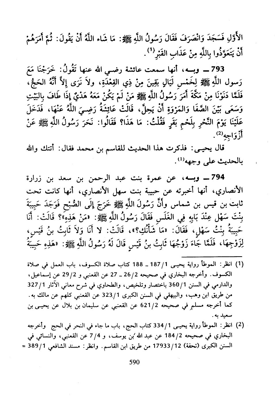 794 - وَبِهِ، عَنْ عَمْرَةَ بِنْتِ عَبْدِ الرَّحْمَنِ بْنِ سَعْدِ بْنِ زُرَارَةَ الأَنْصَارِيِّ، أَنَّهَا أَخْبَرَتْهُ عَنْ حَبِيبَةَ بِنْتِ سَهْلٍ الأَنْصَارِيِّ، أَنَّهَا كَانَتْ تَحْتَ ثَابِتِ بْنِ قَيْسِ بْنِ شَمَّاسٍ، وَأَنَّ رَسُولَ اللَّهِ صَلَّى اللَّهُ عَلَيْهِ وَسَلَّمَ " خَرَجَ إِلَى الصُّبْحِ فَوَجَدَ حَبِيبَةَ بِنْتَ سَهْلٍ عِنْدَ بَابِهِ فِي الْغَلَسِ، فَقَالَ رَسُولُ اللَّهِ صَلَّى اللَّهُ عَلَيْهِ وَسَلَّمَ: مَنْ هَذِهِ؟ قَالَتْ: أَنَا حَبِيبَةُ بِنْتُ سَهْلٍ.