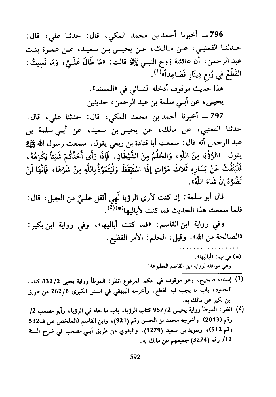 797 - أَخْبَرَنَا أَحْمَدُ بْنُ مُحَمَّدٍ الْمَكِّيُّ، قَالَ: حَدَّثَنَا عَلِيٌّ، قَالَ: حَدَّثَنَا الْقَعْنَبِيُّ، عَنْ مَالِكٍ، عَنْ يَحْيَى بْنِ سَعِيدٍ، عَنْ أَبِي سَلَمَةَ بْنِ عَبْدِ الرَّحْمَنِ، أَنَّهُ قَالَ: سَمِعْتُ أَبَا قَتَادَةَ بْنَ رِبْعِيٍّ، يَقُولُ: سَمِعْتُ رَسُولَ اللَّهِ صَلَّى اللَّهُ عَلَيْهِ وَسَلَّمَ، يَقُولُ: «الرُّؤْيَا مِنَ اللَّهِ، وَالْحُلْمُ مِنَ الشَيْطَانِ، فَإِذَا رَأَى أَحَدُكُمْ شَيْئًا يَكْرَهُهُ، فَلْيَنْفُثْ عَنْ يَسَارِهِ ثَلاثَ مَرَّاتٍ إِذَا اسْتَيْقَظَ وَلْيَتَعَوَّذْ بِاللَّهِ مِنْ شَرِّهَا، فَإِنَّهَا لَنْ تَضُرَّهُ إِنْ شَاءَ اللَّهُ».