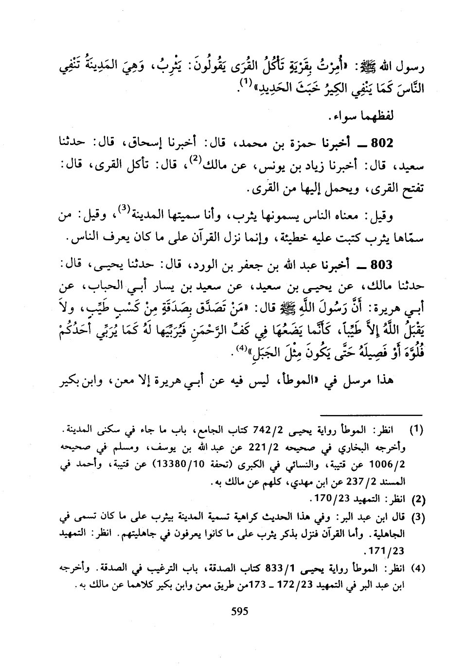 803 - أَخْبَرَنَا عَبْدُ اللَّهِ بْنُ جَعْفَرِ بْنِ الْوَرْدِ، قَالَ: حَدَّثَنَا يَحْيَى، قَالَ: حَدَّثَنَا مَالِكٌ، عَنْ يَحْيَى بْنِ سَعِيدٍ، عَنْ سَعِيدِ بْنِ يَسَارٍ أَبِي الْحُبَابِ، عَنْ أَبِي هُرَيْرَةَ: أَنَّ رَسُولَ اللَّهِ صَلَّى اللَّهُ عَلَيْهِ وَسَلَّمَ، قَالَ: «مَنْ تَصَدَّقَ بِصَدَقَةٍ مِنْ كَسْبٍ طَيِّبٍ، وَلا يَقْبَلُ اللَّهُ إِلا طَيِّبًا، كَأَنَّمَا يَضَعُهَا فِي كَفِّ الرَّحْمَنِ فَيُرَبِّيَهَا لَهُ كَمَا يُرَبِّي أَحَدُكُمْ فُلُوَّهَ أَوْ فَصِيلَهُ حَتَّى يَكُونَ مِثْلَ الْجَبَلِ».