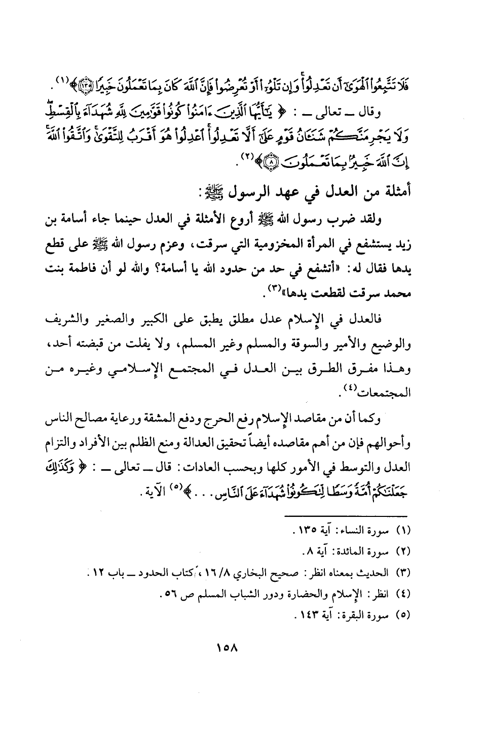 ولقد ضرب رسول الله - صلى الله عليه وسلم - أروع الأمثلة في العدل حينما جاء أسامة بن زيد يستشفع في المرأة المخزومية التي سرقت، وعزم رسول الله - صلى الله عليه وسلم - على قطع يدها فقال له: "أتشفع في حد من حدود الله يا أسامة؟ والله لو أن فاطمة بنت محمد سرقت لقطعت يدها" (¬3).