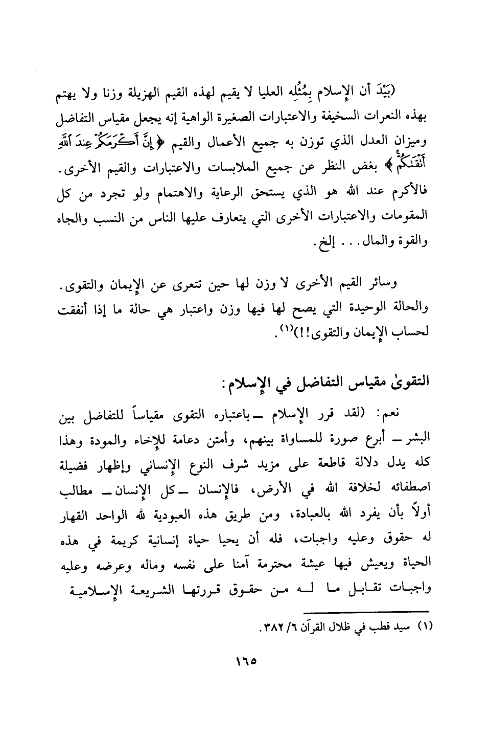 (بَيْدَ أن الإِسلام بِمُثُلِه العليا لا يقيم لهذه القيم الهزيلة وزنا ولا يهتم بهذه النعرات السخيفة والاعتبارات الصغيرة الواهية إنه يجعل مقياس التفاضل وميزان العدل الذي توزن به جميع الأعمال والقيم {إِنَّ أَكْرَمَكُمْ عِنْدَ اللهِ أَتْقَاكُمْ إِنَّ اللَّهَ عَلِيمٌ خَبِيرٌ} بغض النظر عن جميع الملابسات والإعتبارات والقيم الأخرى. فالأكرم عند الله هو الذي يستحق الرعاية والإهتمام ولو تجرد من كل المقومات والإعتبارات الأخرى التي يتعارف عليها الناس من النسب والجاه والقوة والمال ... إلخ.