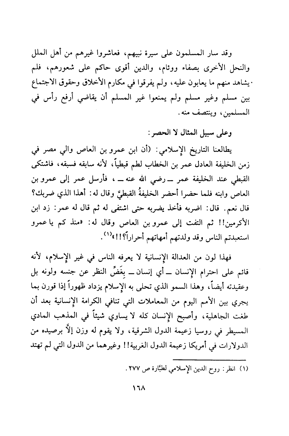 فهذا لون من العدالة الإِنسانية لا يعرفه الناس في غير الإِسلام، لأنه قائم على احترام الإِنسان -أي إنسان - بِغَضِّ النظر عن جنسه ولونه بل وعقيدته أيضًا، وهذا السمو الذي تحلى به الإِسلام يزداد ظهورًا إذا قورن بما يجري بين الأمم اليوم من المعاملات التي تنافي الكرامة الإِنسانية بعد أن طغت الجاهلية، وأصبح الإِنسان كله لا يساوي شيئًا في المذهب المادي المسيطر في روسيا زعيمة الدول الشرقية، ولا يقوم له وزن إلَّا برصيده من الدولارات في أمريكا زعيمة الدول الغربية!! وغيرهما من الدول التي لم تهتد