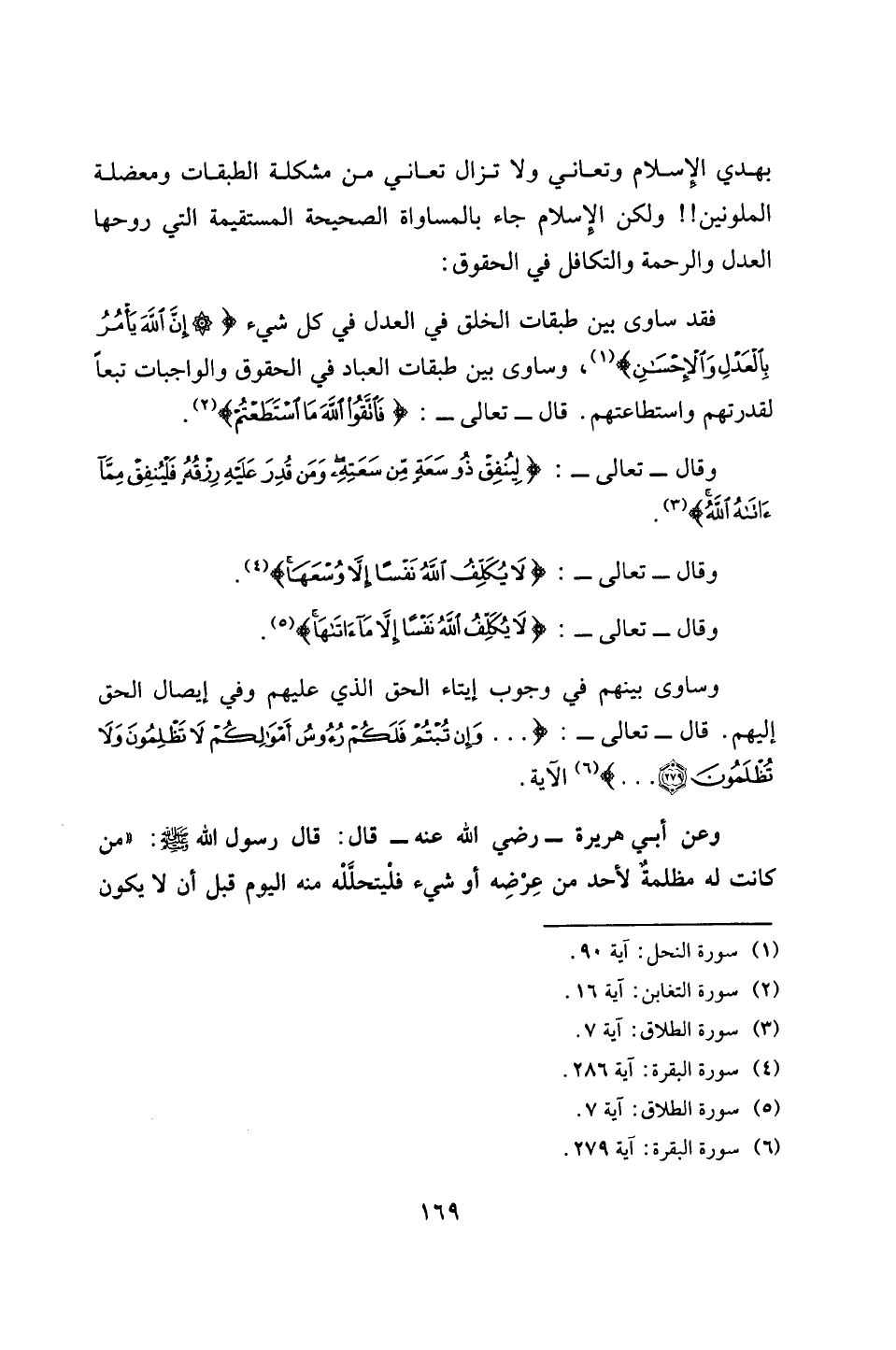 بهدي الإِسلام وتعاني ولا تزال تعاني من مشكلة الطبقات ومعضلة الملونين!! ولكن الإِسلام جاء بالمساواة الصحيحة المستقيمة التي روحها العدل والرحمة والتكافل في الحقوق: