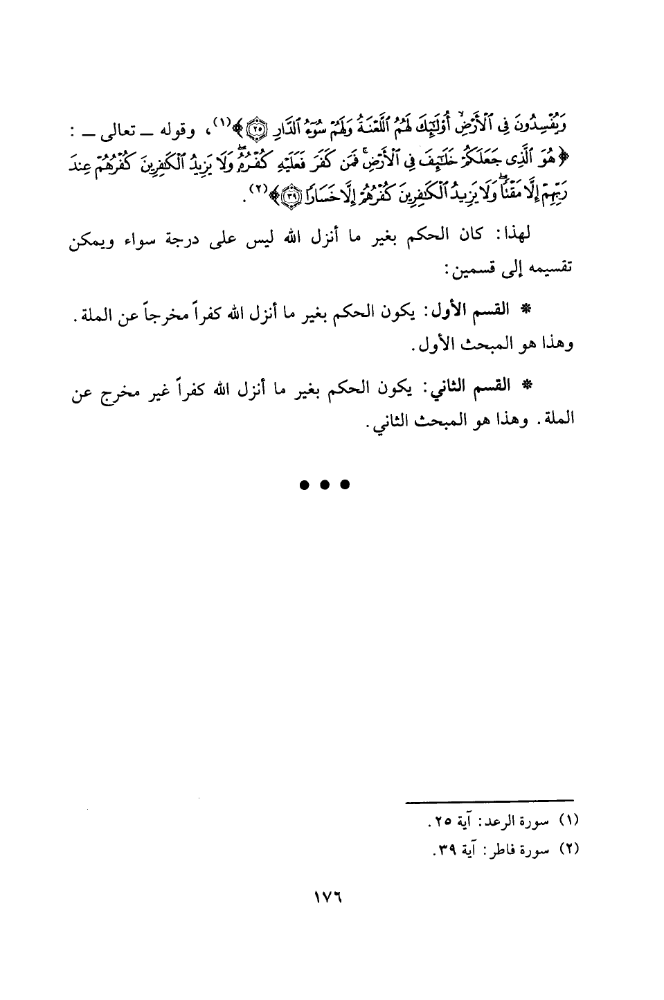 * القسم الثاني: يكون الحكم بغير ما أنزل الله كفراً غير مخرج عن الملة. وهذا هو المبحث الثاني.