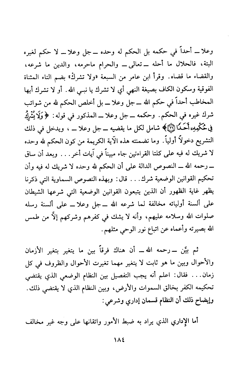 ثم بيَّن -رَحِمَهُ اللهُ- أن هناك فرقًا بين ما يتغير بتغير الأزمان والأحوال وبين ما هو ثابت لا يتغير مهما تغيرت الأحوال والظروف في كل زمان ... فقال: اعلم أنه يجب التفصيل بين النظام الوضعي الذي يقتضي تحكيمه الكفر بخالق السموات والأرض، وبين النظام الذي لا يقتضي ذلك. وإيضاح ذلك أن النظام قسمان إداري وشرعي: