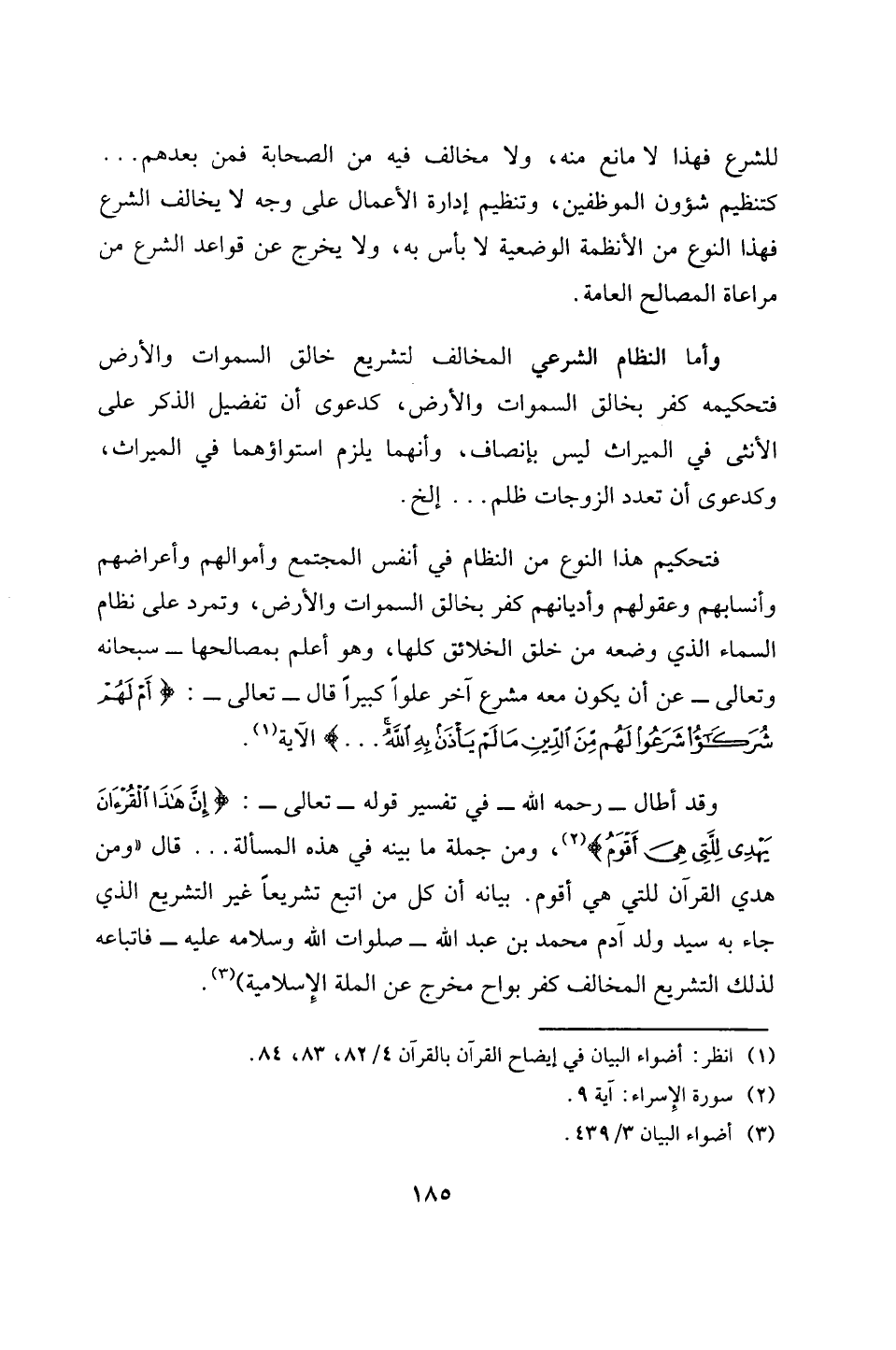 وقد أطال -رَحِمَهُ اللهُ- في تفسير قوله -تعالى-: {إِنَّ هَذَا الْقُرْآنَ يَهْدِي لِلَّتِي هِيَ أَقْوَمُ ...} (¬2)، ومن جملة ما بينه في هذه المسألة ... قال "ومن هدي القرآن للتي هي أقوم. بيانه أن كل من اتبع تشريعًا غير التشريع الذي جاء به سيد ولد آدم محمد بن عبد الله - صلوات الله وسلامه عليه - فاتباعه لذلك التشريع المخالف كفر بواح مخرج عن الملة الإِسلامية) (¬3).