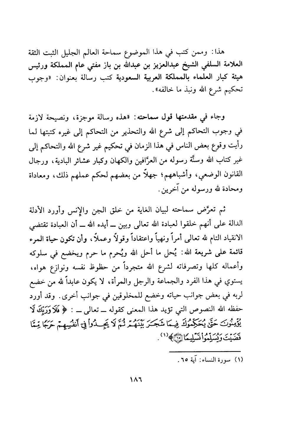 هذا: وممن كتب في هذا الموضوع سماحة العالم الجليل الثبت الثقة العلامة السلفي الشيخ عبد العزيز بن عبد الله بن باز مفتي عام المملكة ورئيس هيئة كبار العلماء بالمملكة العربية السعودية كتب رسالة بعنوان: "وجوب تحكيم شرع الله ونبذ ما خالفه".