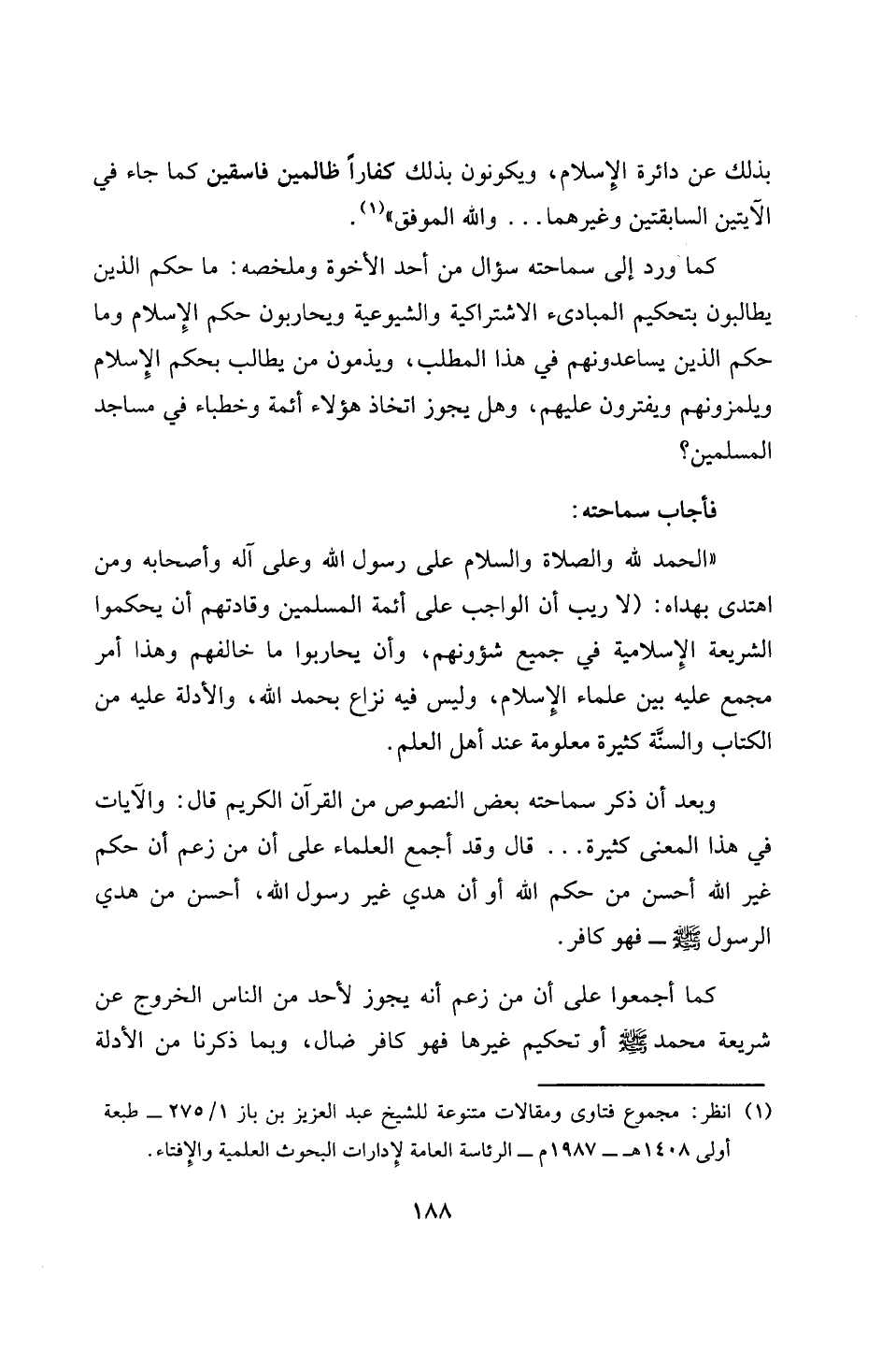 "الحمد لله والصلاة والسلام على رسول الله وعلى آله وأصحابه ومن اهتدى بهداه: (لا ريب أن الواجب على أئمة المسلمين وقادتهم أن يحكموا الشريعة الإِسلامية في جميع شؤونهم، وأن يحاربوا ما خالفهم وهذا أمر مجمع عليه بين علماء الإِسلام، وليس فيه نزاع بحمد الله، والأدلة عليه من الكتاب والسنَّة كثيرة معلومة عند أهل العلم.