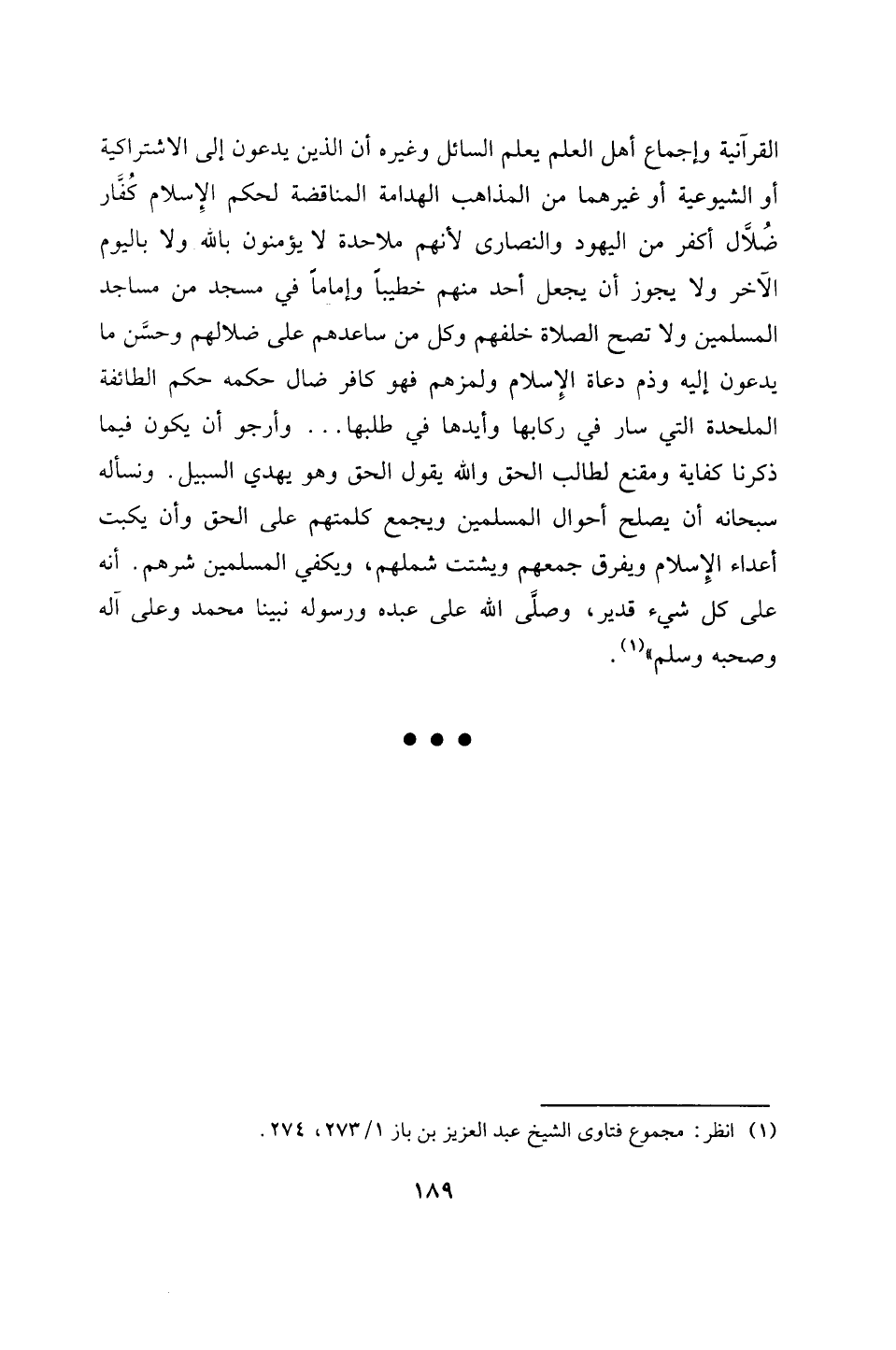 القرآنية وإجماع أهل العلم يعلم السائل وغيره أن الله ين يدعون إلى الاشتراكة أو الشيوعية أو غيرهما من المذاهب الهدامة المناقضة لحكم الإِسلام كُفار ضُلَّال أكفر من اليهود والنصارى لأنهم ملاحدة لا يؤمنون بالله ولا باليوم الآخر ولا يجوز أن يجعل أحد منهم خطيبًا وإمامًا في مسجد من مساجد المسلمين ولا تصح الصلاة خلفهم وكل من ساعدهم على ضلالهم وحسَّن ما يدعون إليه وذم دعاة الإِسلام ولمزهم فهو كافر ضال حكمه حكم الطائفة الملحدة التي سار في ركابها وأيدها في طلبها ... وأرجو أن يكون فيما ذكرنا كفاية ومقنع لطالب الحق والله يقول الحق وهو يهدي السبيل. ونسأله سبحانه أن يصلح أحوال المسلمين ويجمع كلمتهم على الحق وأن يكبت أعداء الإِسلام ويفرق جمعهم ويشتت شملهم، ويكفي المسلمين شرهم. أنه على كل شيء قدير، وصلَّى الله على عبده ورسوله نبينا محمد وعلى آله وصحبه وسلم" (¬1).