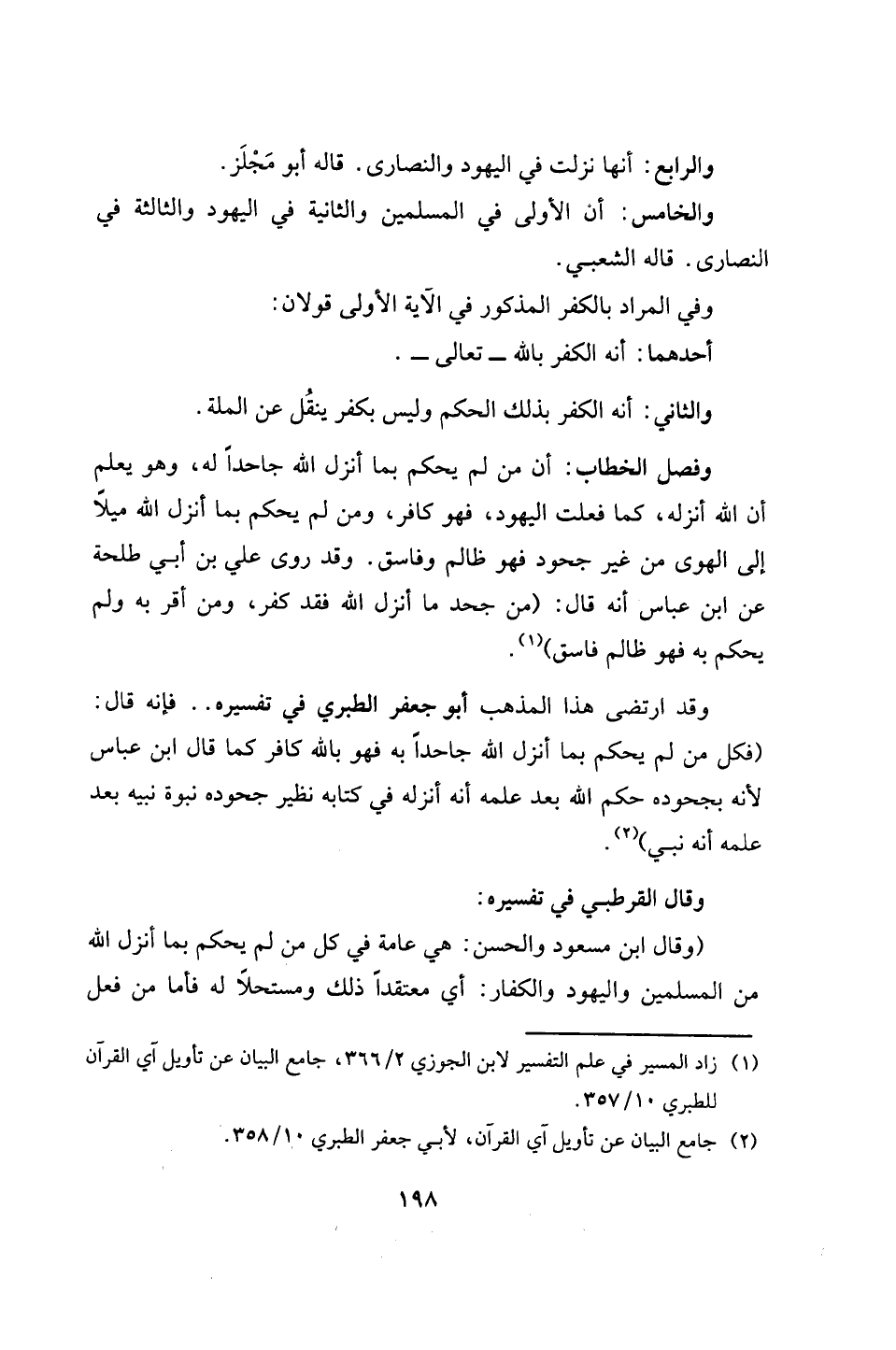 وقد ارتضى هذا المذهب أبو جعفر الطبري في تفسيره .. فإنه قال: (فكل من لم يحكم بما أنزل الله جاحدًا به فهو بالله كافر كما قال ابن عباس لأنه بجحوده حكم الله بعد علمه أنه أنزله في كتابه نظير جحوده نبوة نبيه بعد علمه أنه نبي) (¬2).