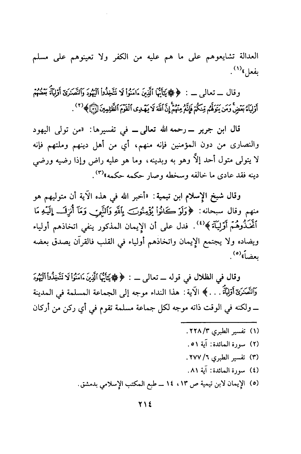 وقال شيخ الإِسلام ابن تيمية: "أخبر الله في هذه الآية أن متوليهم هو منهم وقال سبحانه: {وَلَوْ كَانُوا يُؤْمِنُونَ بِاللَّهِ وَالنَّبِيِّ وَمَا أُنْزِلَ إِلَيْهِ مَا اتَّخَذُوهُمْ أَوْلِيَاءَ} (¬4). فدل على أن الإيمان المذكور ينفي اتخاذهم أولياء ويضاده ولا يجتمع الإيمان واتخاذهم أولياء في القلب فالقرآن يصدق بعضه بعضًا" (¬5).