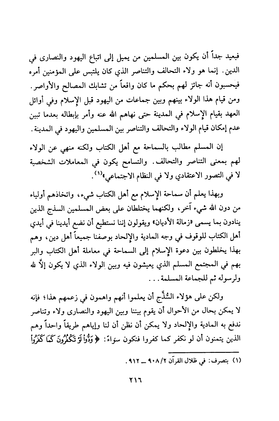 إن المسلم مطالب بالسماحة مع أهل الكتاب ولكنه منهي عن الولاء لهم بمعنى التناصر والتحالف. والتسامح يكون في المعاملات الشخصية لا في التصور الإعتقادي ولا في النظام الإجتماعي" (¬1).