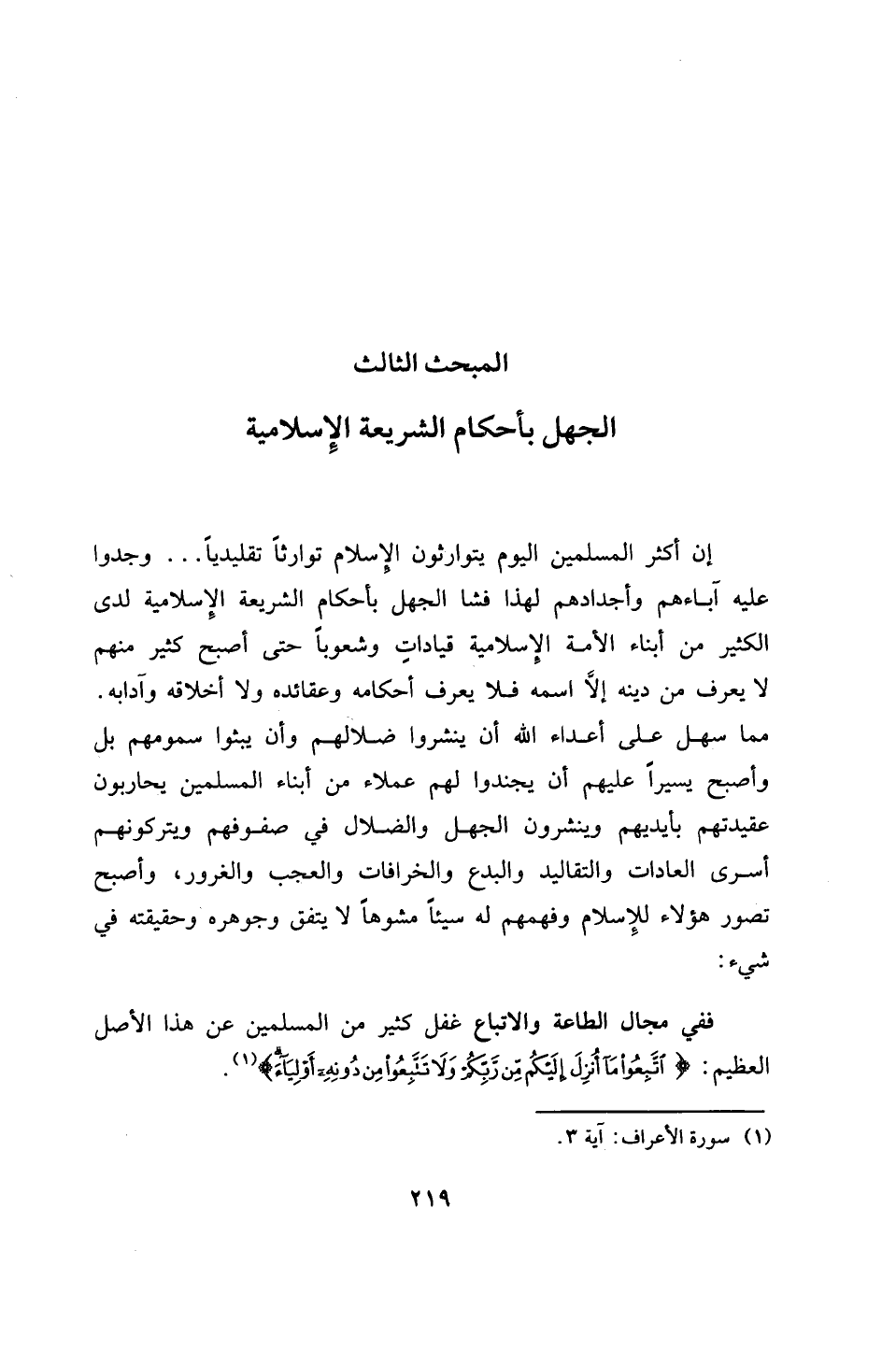 إن أكثر المسلمين اليوم يتوارثون الإِسلام توارثًا تقليديًا ... وجدوا عليه آباءهم وأجدادهم لهذا فشا الجهل بأحكام الشريعة الإِسلامية لدى الكثير من أبناء الأمة الإِسلامية قياداتٍ وشعوبًا حتى أصبح كثير منهم لا يعرف من دينه إلَّا اسمه فلا يعرف أحكامه وعقائده ولا أخلاقه وآدابه. مما سهل على أعداء الله أن ينشروا ضلالهم وأن يبثوا سمومهم بل وأصبح يسيرًا عليهم أن يجندوا لهم عملاء من أبناء المسلمين يحاربون عقيدتهم بأيديهم وينشرون الجهل والضلال في صفوفهم ويتركونهم أسرى العادات والتقاليد والبدع والخرافات والعجب والغرور، وأصبح تصور هؤلاء للإسلام وفهمهم له سيئًا مشوهًا لا يتفق وجوهره وحقيقته في شيء: