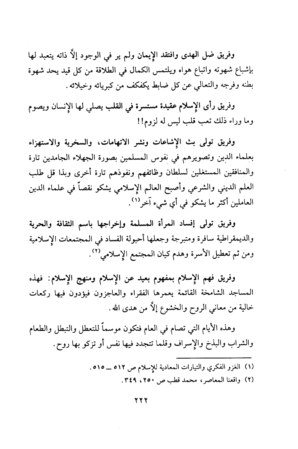 وفريق فهم الإِسلام بمفهوم بعيد عن الإِسلام ومنهج الإِسلام: فهذه المساجد الشامخة القائمة يعمرها الفقراء والعاجزون فيؤدون فيها ركعات خالية من معاني الروح والخشوع إلَّا من هدى الله.