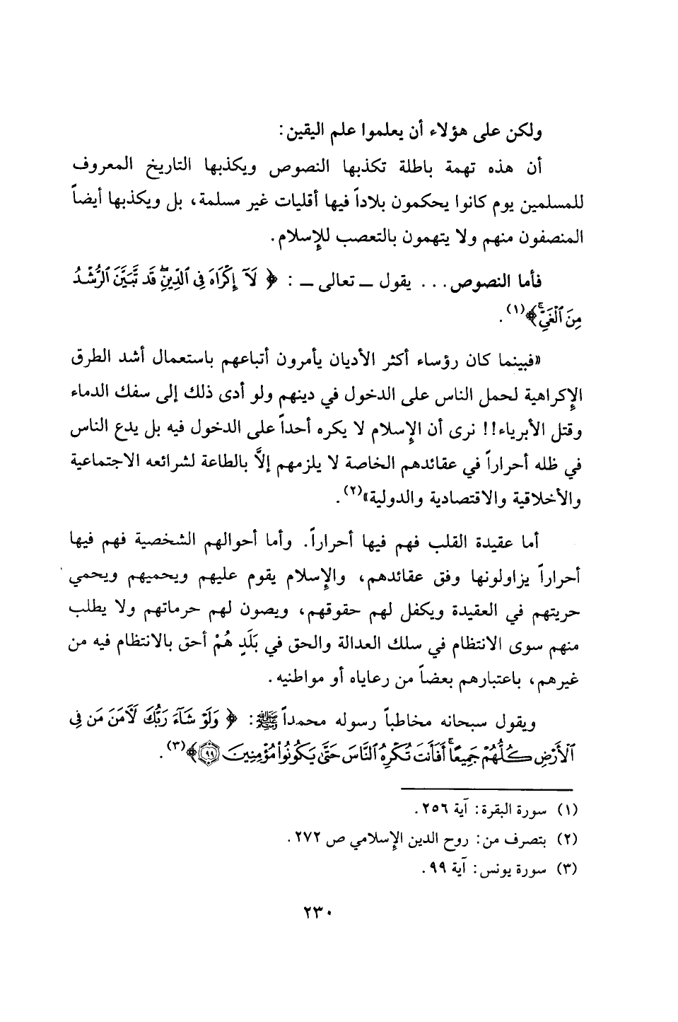 "فبينما كان رؤساء أكثر الأديان يأمرون أتباعهم باستعمال أشد الطرق الإكراهية لحمل الناس على الدخول في دينهم ولو أدى ذلك إلى سفك الدماء وقتل الأبرياء!! نرى أن الإِسلام لا يكره أحدًا على الدخول فيه بل يدع الناس في ظله أحرارًا في عقائدهم الخاصة لا يلزمهم إلَّا بالطاعة لشرائعه الإجتماعية والأخلاقية والإقتصادية والدولية" (¬2).