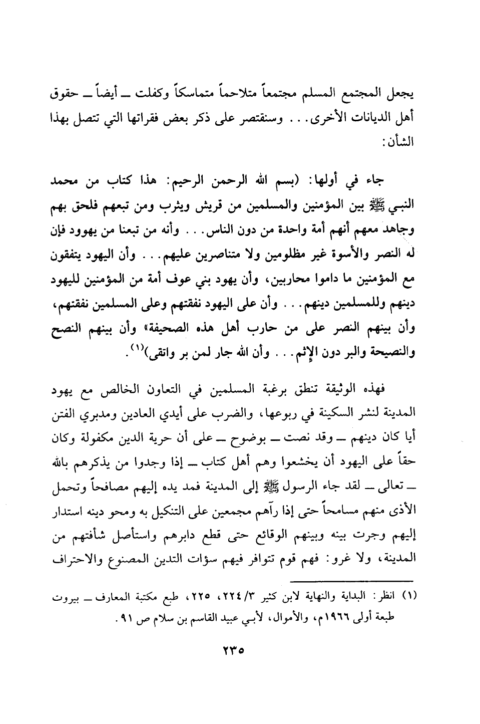 جاء في أولها: (بِسْمِ اللهِ الرَّحْمَنِ الرَّحِيمِ: هذا كتاب من محمد النبي - صلى الله عليه وسلم - بين المؤمنين والمسلمين من قريش ويثرب ومن تبعهم فلحق بهم وجاهد معهم أنهم أمة واحدة من دون الناس ... وأنه من تبعنا من يهود فإن له النصر والأسوة غير مظلومين ولا متناصرين عليهم ... وأن اليهود يتفقون مع المؤمنين ما داموا محاربين، وأن يهود بني عوف أمة من المؤمنين لليهود دينهم وللمسلمين دينهم ... وأن على اليهود نفقتهم وعلى المسلمين نفقتهم، وأن بينهم النصر على من حارب أهل هذه الصحيفة" وأن بينهم النصح والنصيحة والبر دون الإثم ... وأن الله جار لمن بر واتقى) (¬1).