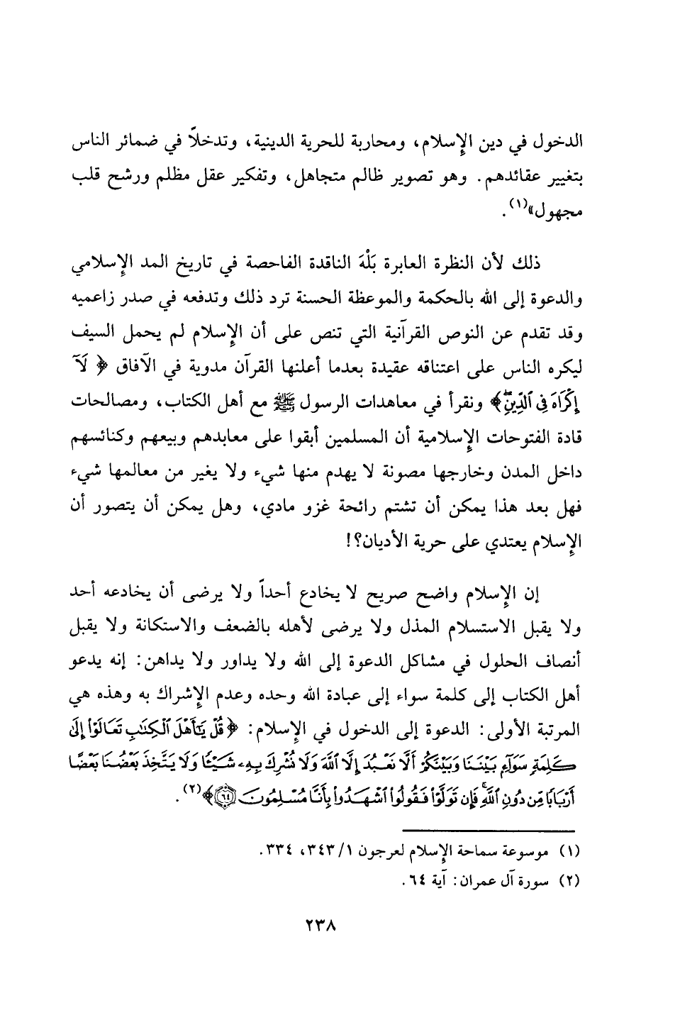 ذلك لأن النظرة العابرة بَلْهَ الناقدة الفاحصة في تاريخ المد الإِسلامي والدعوة إلى الله بالحكمة والموعظة الحسنة ترد ذلك وتدفعه في صدر زاعميه وقد تقدم عن النصوص القرآنية التي تنص على أن الإِسلام لم يحمل السيف ليكره الناس على اعتناقه عقيدة بعدما أعلنها القرآن مدوية في الآفاق {لَا إِكْرَاهَ فِي الدِّينِ} ونقرأ في معاهدات الرسول - صلى الله عليه وسلم - مع أهل الكتاب، ومصالحات قادة الفتوحات الإِسلامية أن المسلمين أبقوا على معابدهم وبيعهم وكنائسهم داخل المدن وخارجها مصونة لا يهدم منها شيء ولا يغير من معالمها شيء فهل بعد هذا يمكن أن تشتم رائحة غزو مادي، وهل يمكن أن يتصور أن الإِسلام يعتدي على حرية الأديان؟!