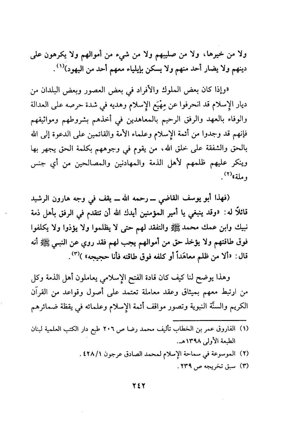 "وإذا كان بعض الملوك والأفراد في بعض العصور وبعض البلدان من ديار الإِسلام قد انحرفوا عن مِهْيَع الإِسلام وهديه في شدة حرصه على العدالة والوفاء بالعهد والرفق الرحيم بالمعاهدين في أخذهم بشروطهم ومواثيقهم فإنهم قد وجدوا من أئمة الإِسلام وعلماء الأمة والقائمين على الدعوة إلى الله بالحق والشفقة على خلق الله، من يقوم في وجوههم بكلمة الحق يجهر بها وينكر عليهم ظلمهم لأهل الذمة والمهادنين والمصالحين من أي جنس وملة" (¬2).
