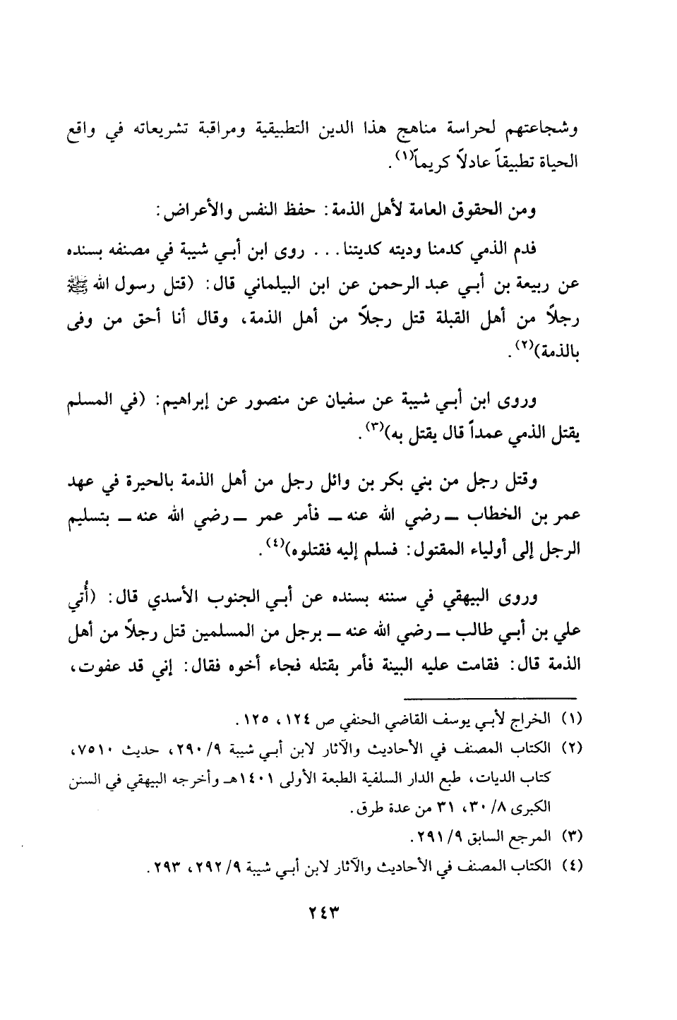 (¬2) الكتاب المصنف في الأحاديث والآثار لإبن أبي شيبة 9/ 290، حديث 7510، كتاب الديات، طبع الدار السلفية الطبعة الأولى 1401 هـ وأخرجه البيهقي في السنن الكبرى 8/ 30، 31 من عدة طرق.