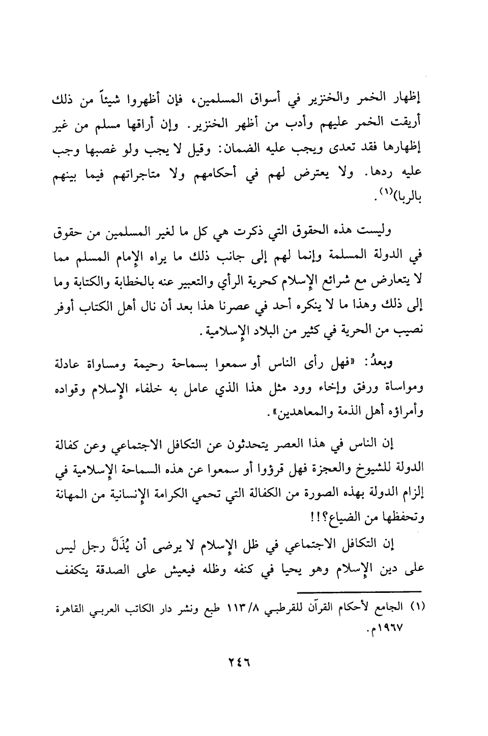 وبعدُ: "فهل رأى الناس أو سمعوا بسماحة رحيمة ومساواة عادلة ومواساة ورفق وإخاء وود مثل هذا الذي عامل به خلفاء الإِسلام وقواده وأمراؤه أهل الذمة والمعاهدين".