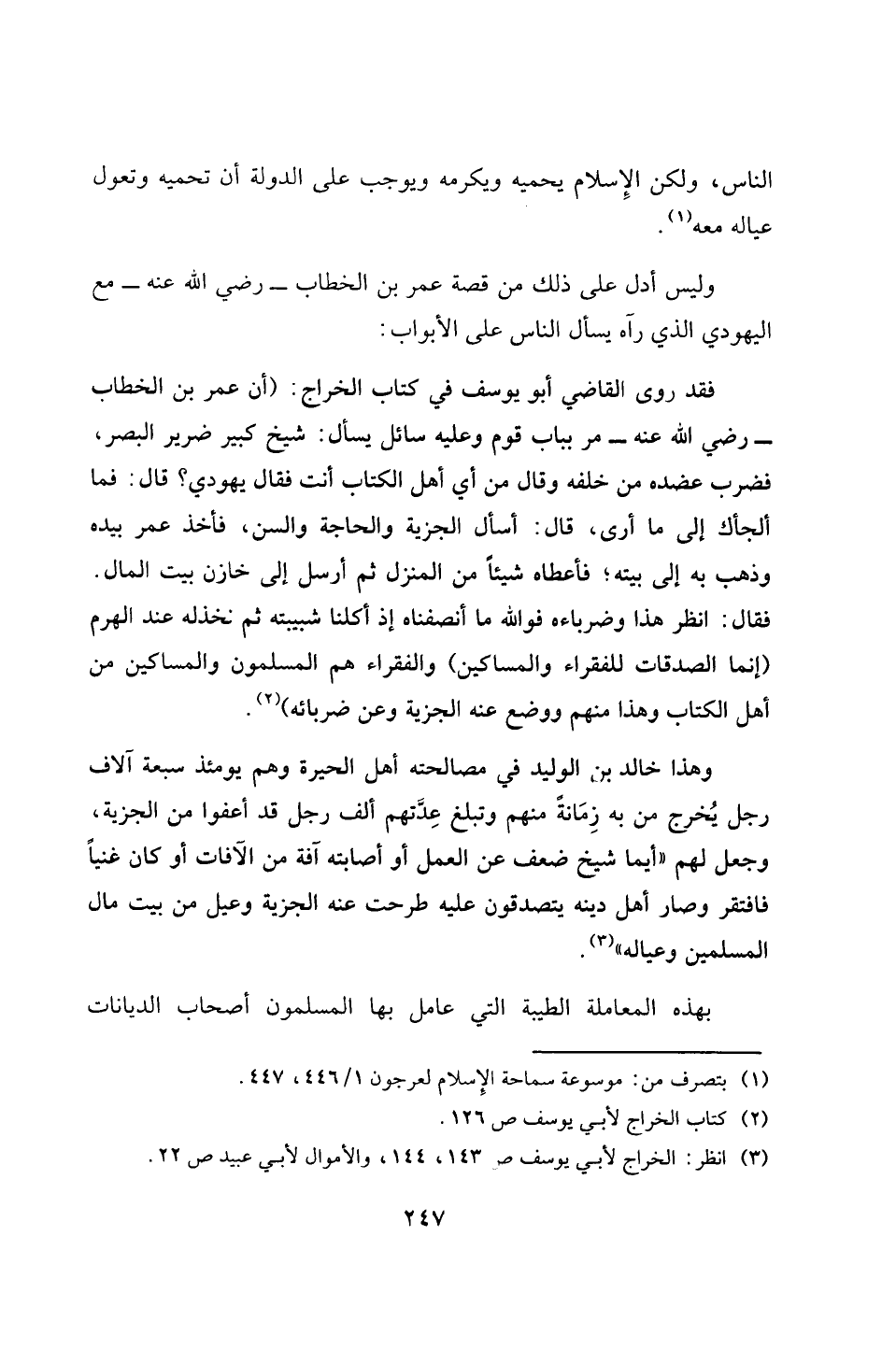 فقد روى القاضي أبو يوسف في كتاب الخراج: (أن عمر بن الخطاب - رضي الله عنه - مر بباب قوم وعليه سائل يسأل: شيخ كبير ضرير البصر، فضرب عضد 5 من خلفه وقال من أي أهل الكتاب أنت فقال يهودي؟ قال: فما ألجأك إلى ما أرى، قال: أسأل الجزية والحاجة والسن، فأخذ عمر بيده وذهب به إلى بيته؛ فأعطاه شيئًا من المنزل ثم أرسل إلى خازن بيت المال. فقال: انظر هذا وضرباءه فوالله ما أنصفناه إذ أكلنا شبيبته ثم نخذله عند الهرم (إنما الصدقات للفقراء والمساكين) والفقراء هم المسلمون والمساكين من أهل الكتاب وهذا منهم ووضع عنه الجزية وعن ضربائه) (¬2).