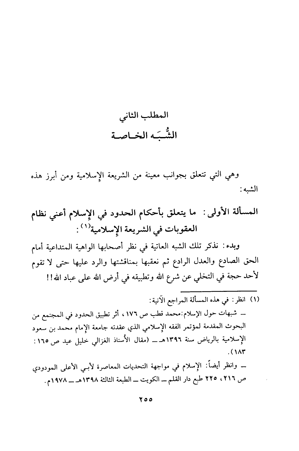 المسألة الأولى: ما يتعلق بأحكام الحدود في الإِسلام أعني نظام العقوبات في الشريعة الإِسلامية (¬1):