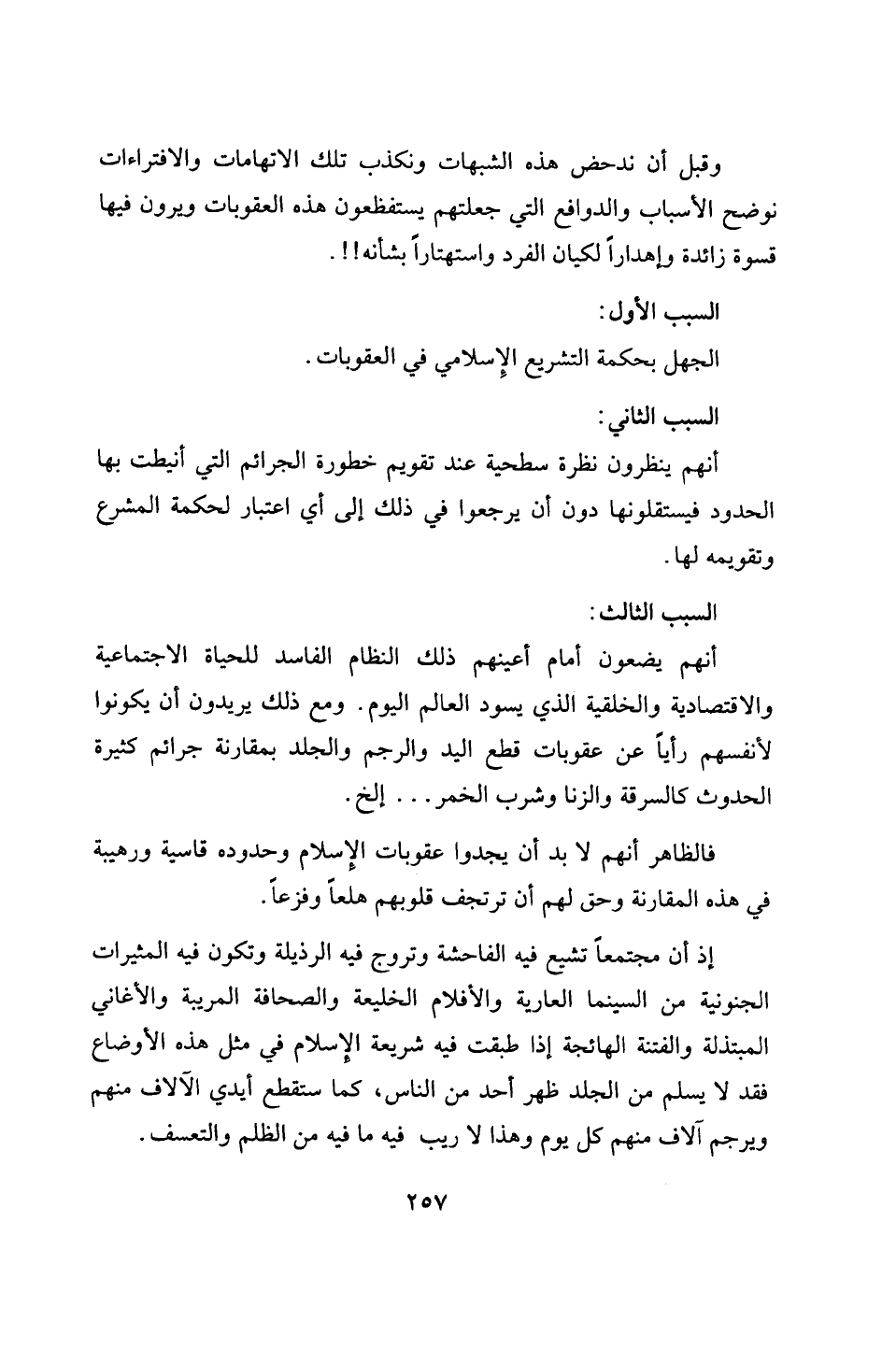 أنهم يضعون أمام أعينهم ذلك النظام الفاسد للحياة الإجتماعية والاقتصادية والخلقية الذي يسود العالم اليوم. ومع ذلك يريدون أن يكونوا لأنفسهم رأيًا عن عقوبات قطع اليد والرجم والجلد بمقارنة جرائم كثيرة الحدوث كالسرقة والزنا وشرب الخمر ... إلخ.